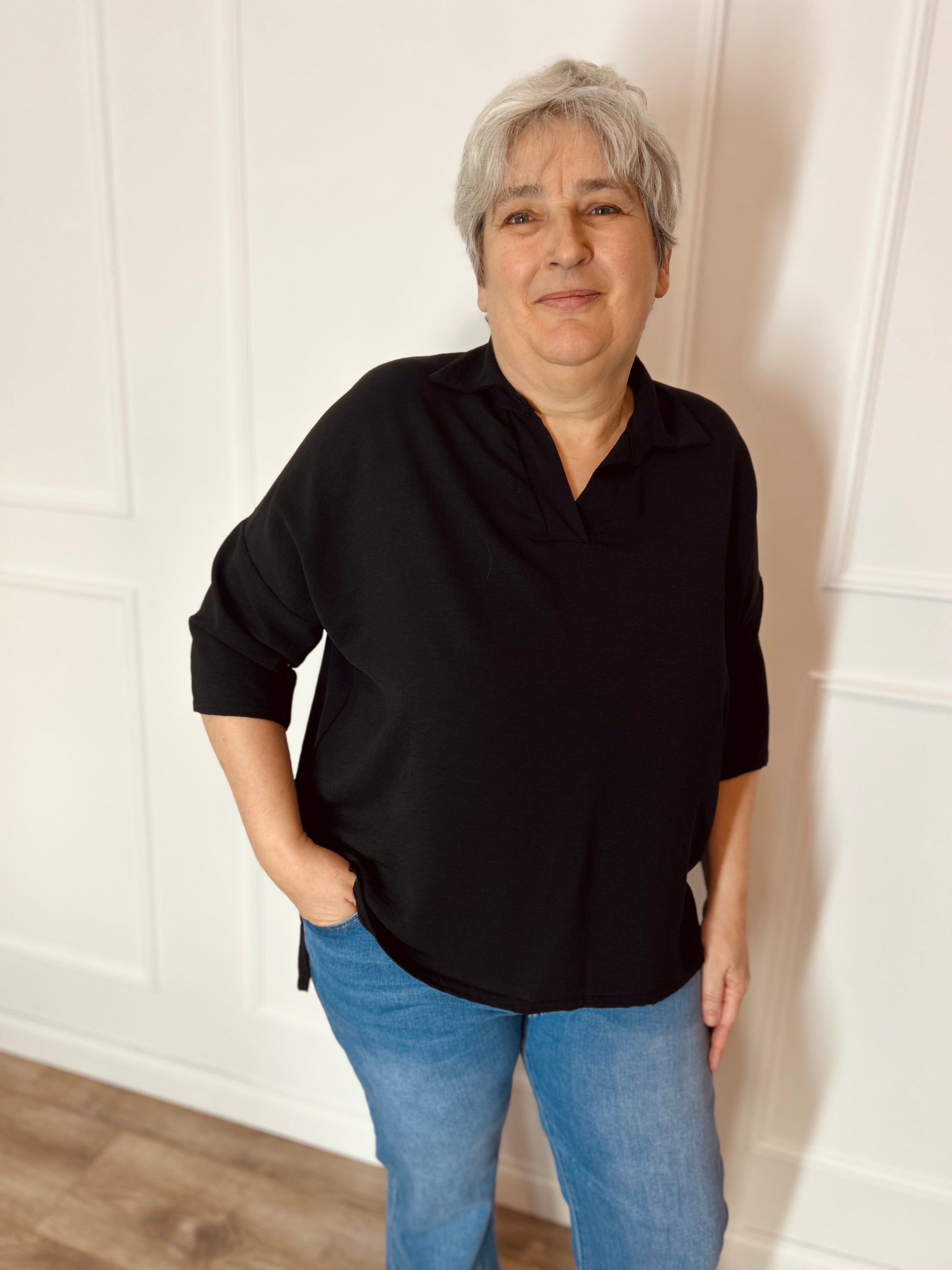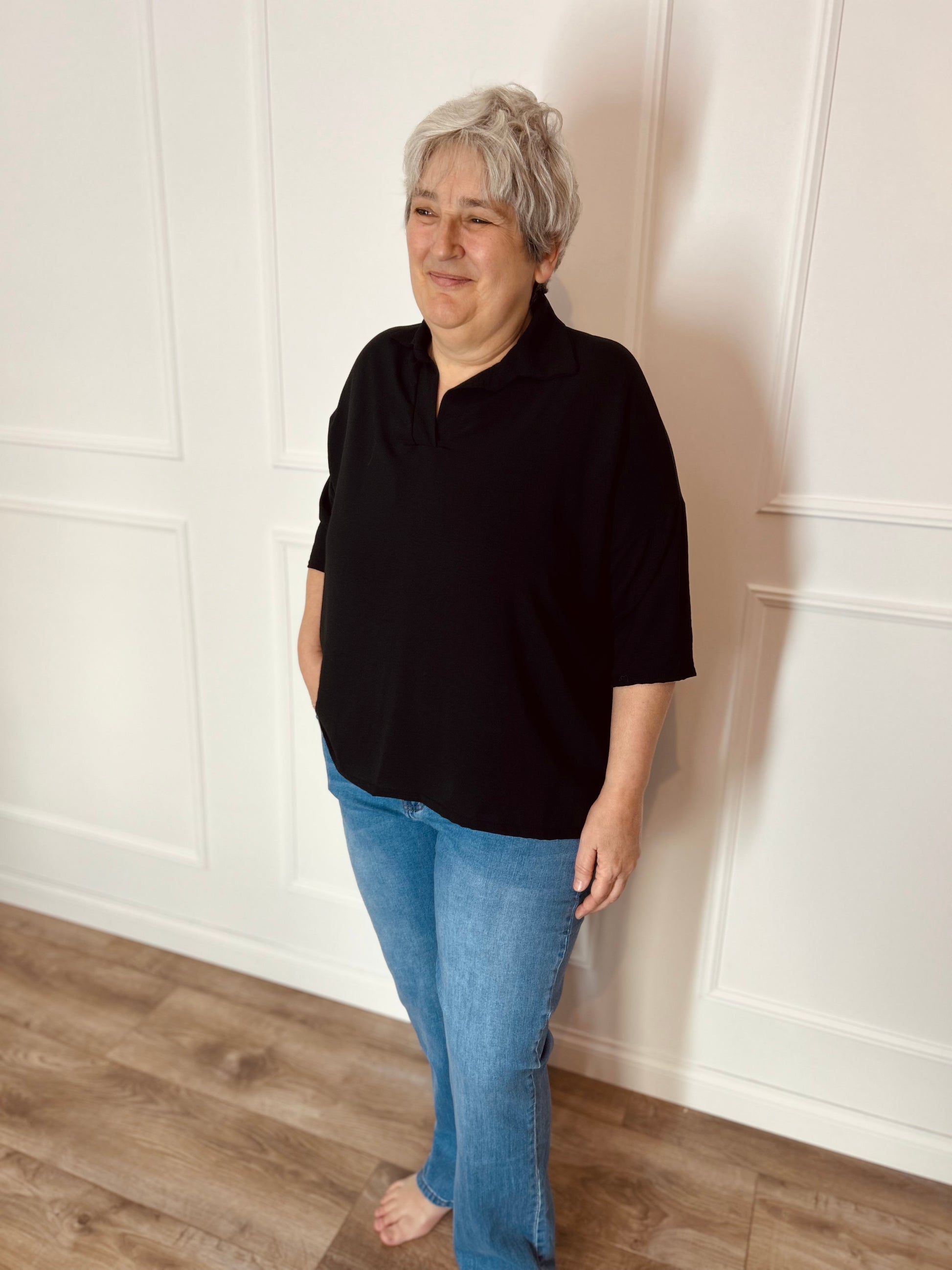 Deze blouse heeft een V-hals en kraagje. De blouse heeft 3/4de mouwen en is een luchtig stofje! We combineerden deze blouse met onze "TEDDY VEST PAULINE XL" voor een leuk touch!
