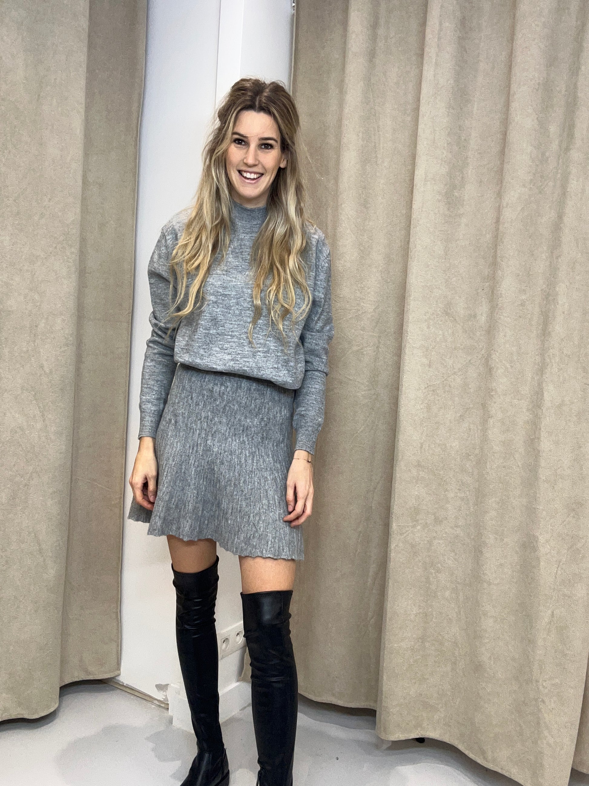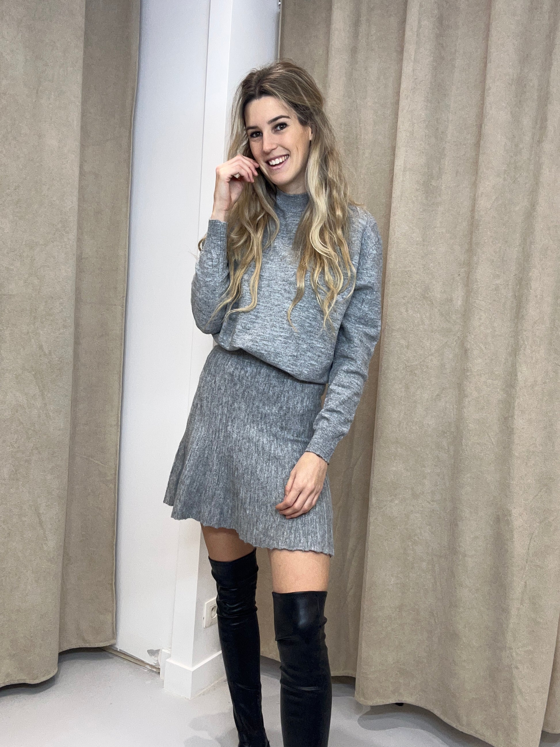 Deze rok heeft een superzachte, zwarte wollen stof met bovenaan een elastiek. Deze rok heeft een soort plissé effect. Wij combineren deze rok met de 'TRUI ROSY GRIJS '. Deze rok hebben we in 1 maat en kan gedragen worden voor maat 36 & 38.