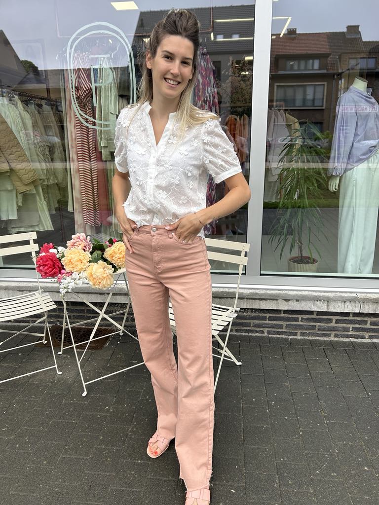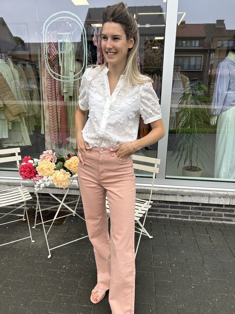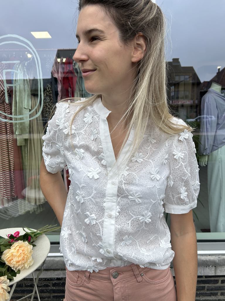 Kanten blousje met knopen aan de voorkant van boven tot onder. Het kanten blousje heeft leuke margeriet bloemetjes erop. Het blousje heeft korte mouwen en is doorschijnend. Het blousje kan je eindeloos combineren. We hebben dit blousje in 3 maten: S-M-L.