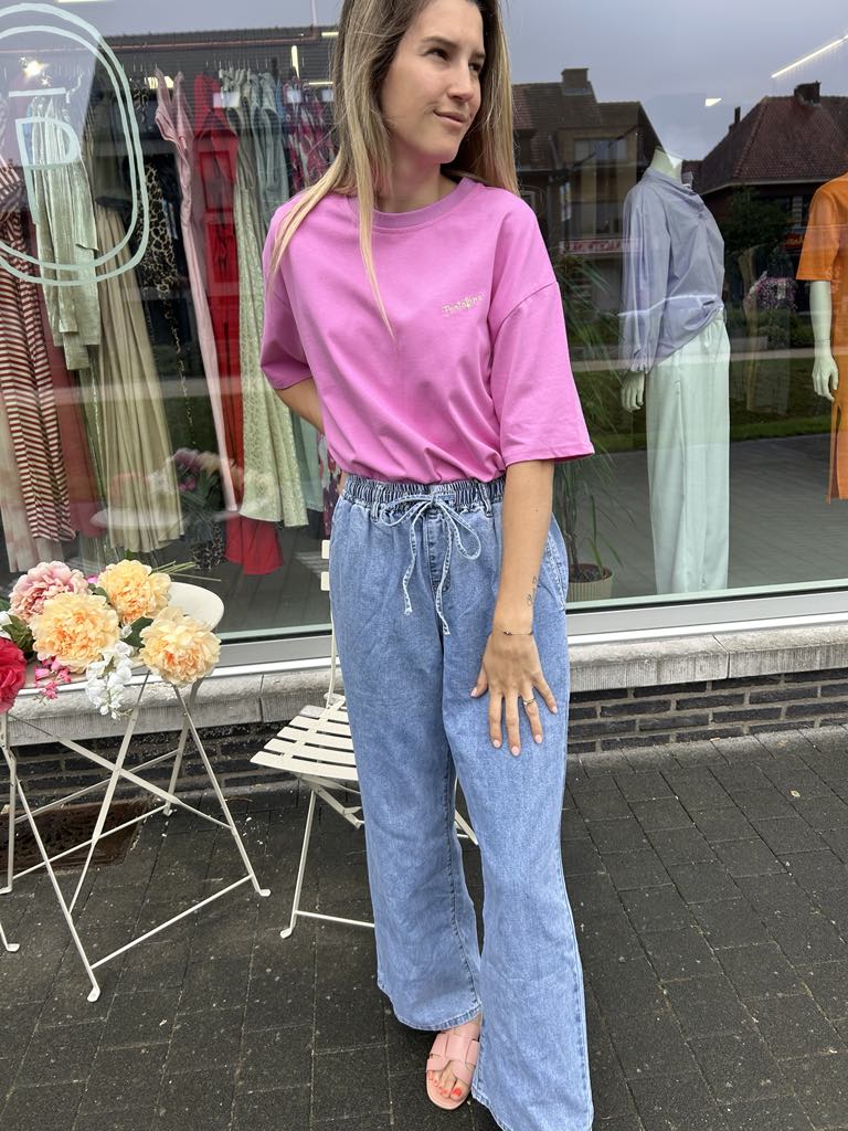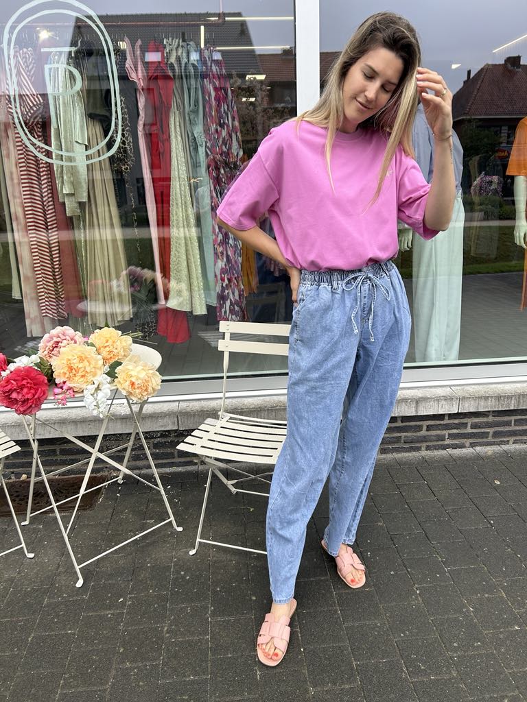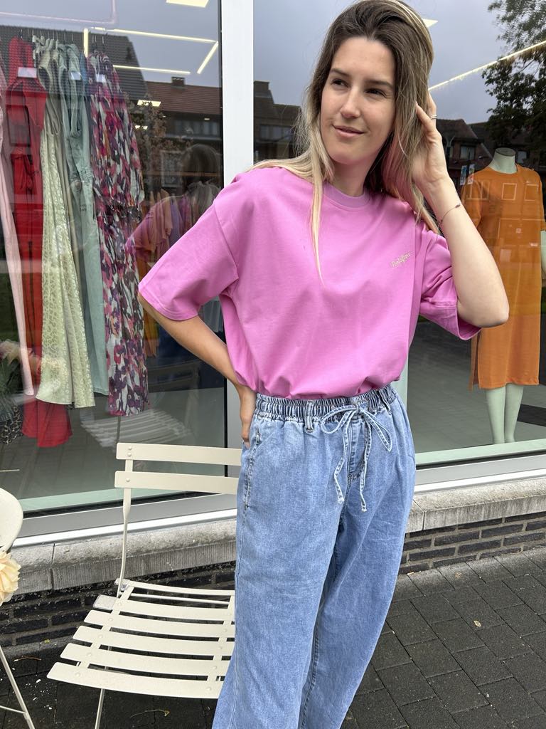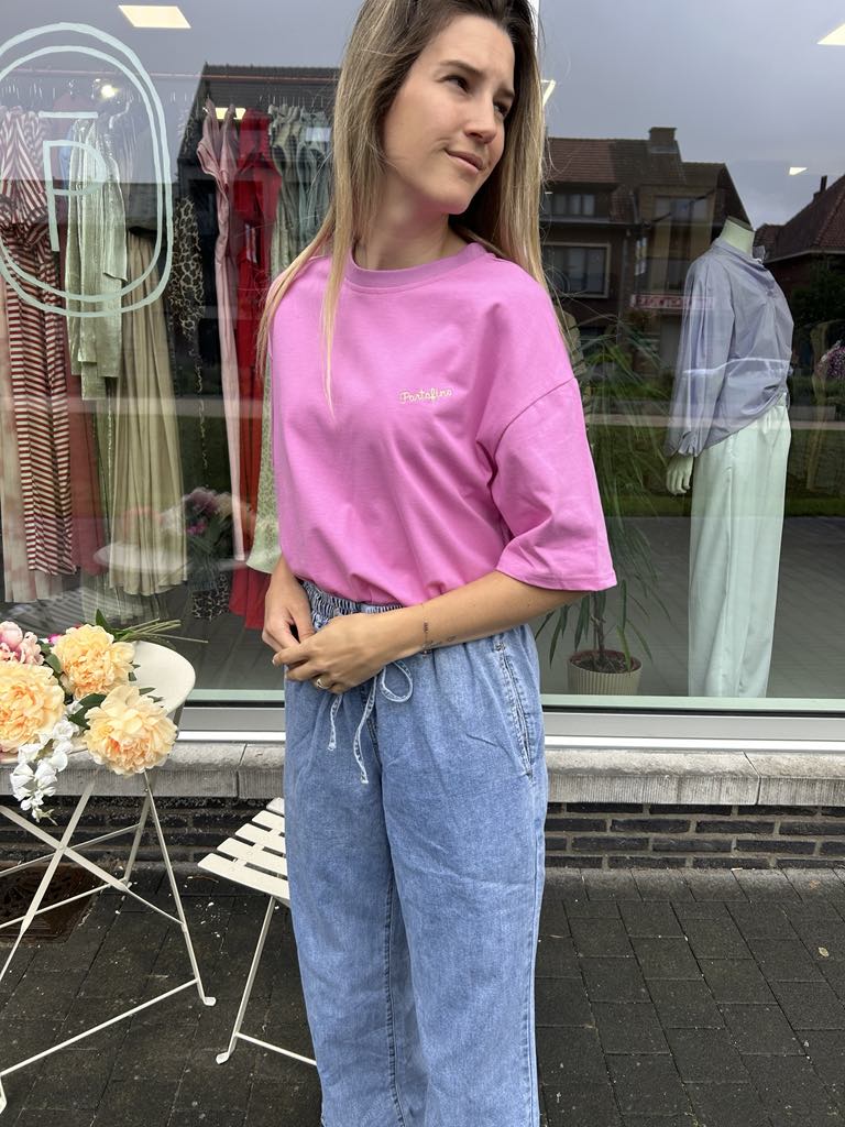 Basic oversized fit T-shirt. Deze T-shirt heeft een paars/roze kleur en heeft de opschrift 'Portofino3 in groene letters. Het T-shirt heeft een ronde hals en korte mouwen. De T-shirt heeft een losse fit, maar ik steek deze graag in mijn broek waardoor dit niet stoort.