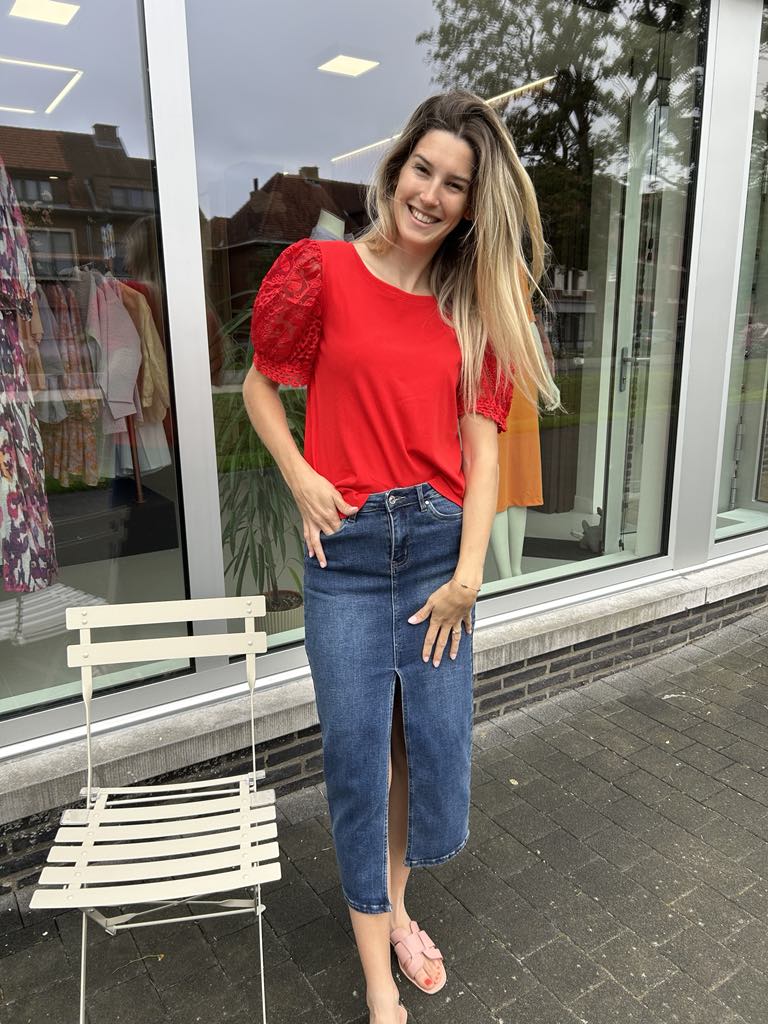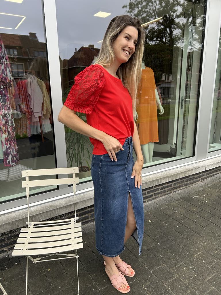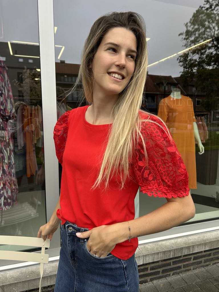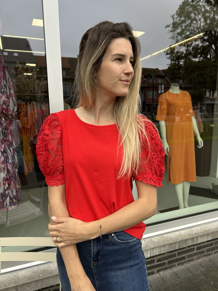 T-shirt met mooie kanten mouwen. De t-shirt heeft een ronde hals en korte mouwen. Het is een comfy t-shirt door de aangename katoenen stof. We hebben deze t-shirt in 2 kleuren namelijk zwart en rood.