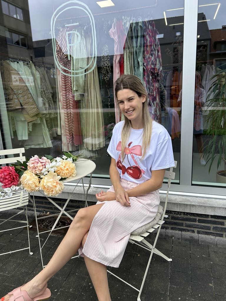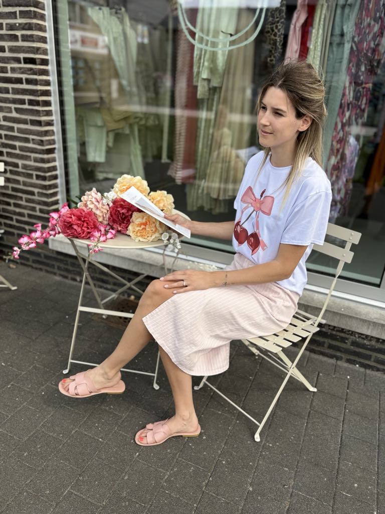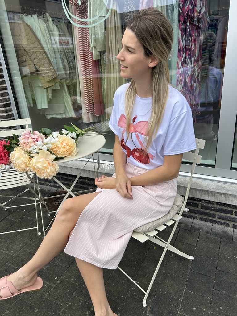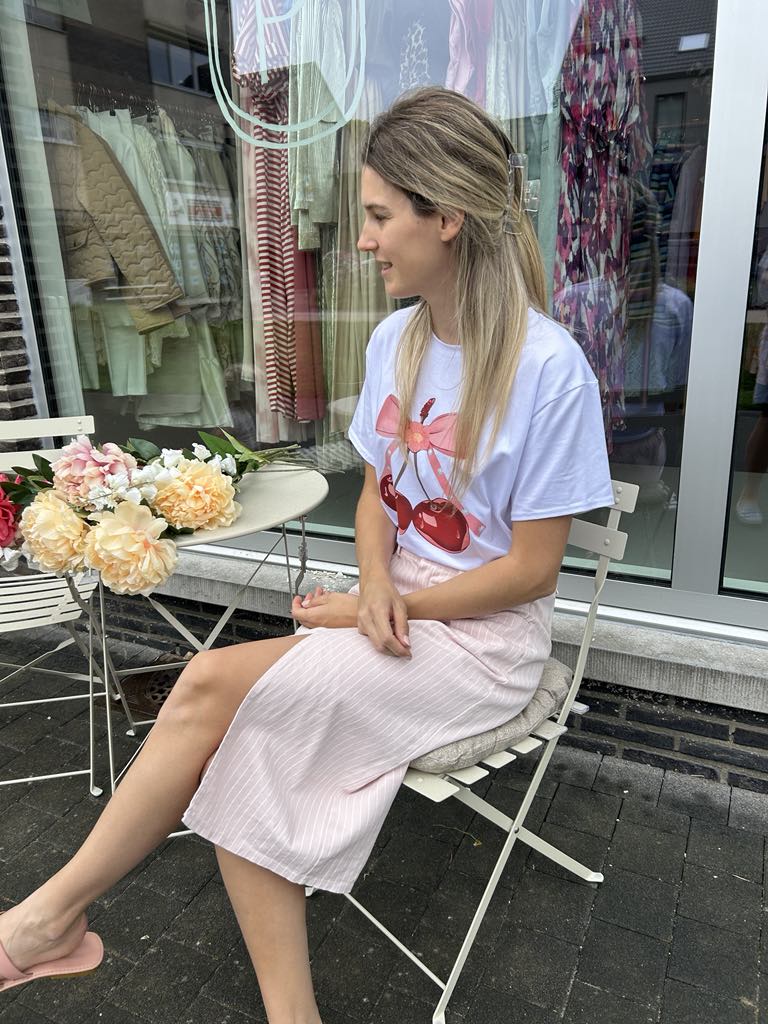Leuk wit t-shirt met een bedrukking van een kers op de voorkant. Dit geeft het een leuk detail en een zomerse vibe! De t-shirt heeft een ronde hals en korte mouwen. De t-shirt is oversized en kan gedragen worden van maat 38 tem 42.