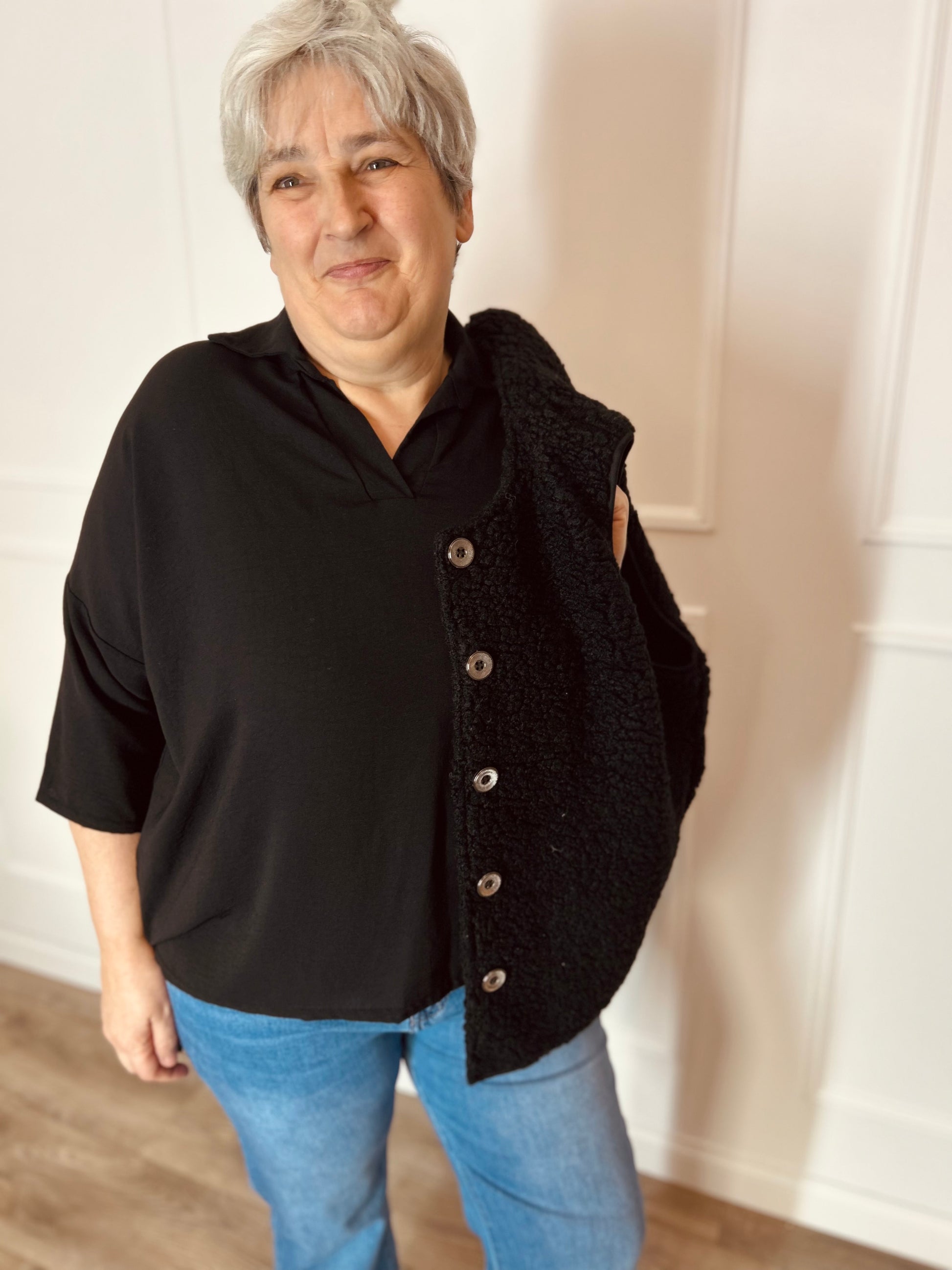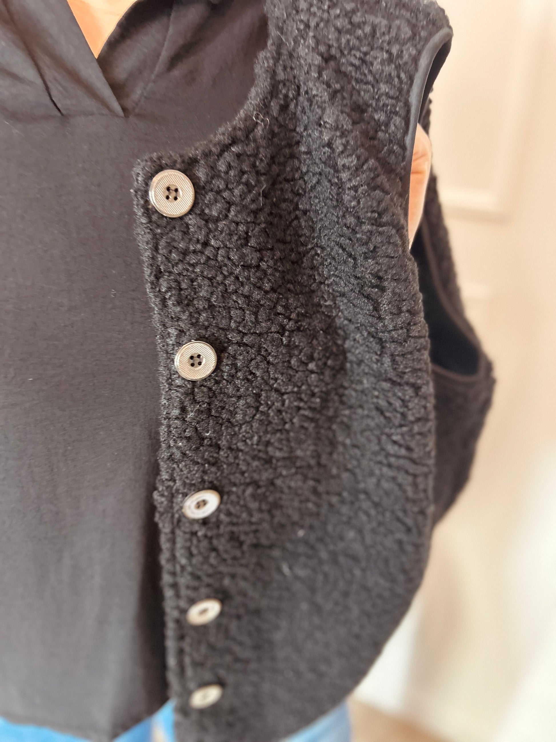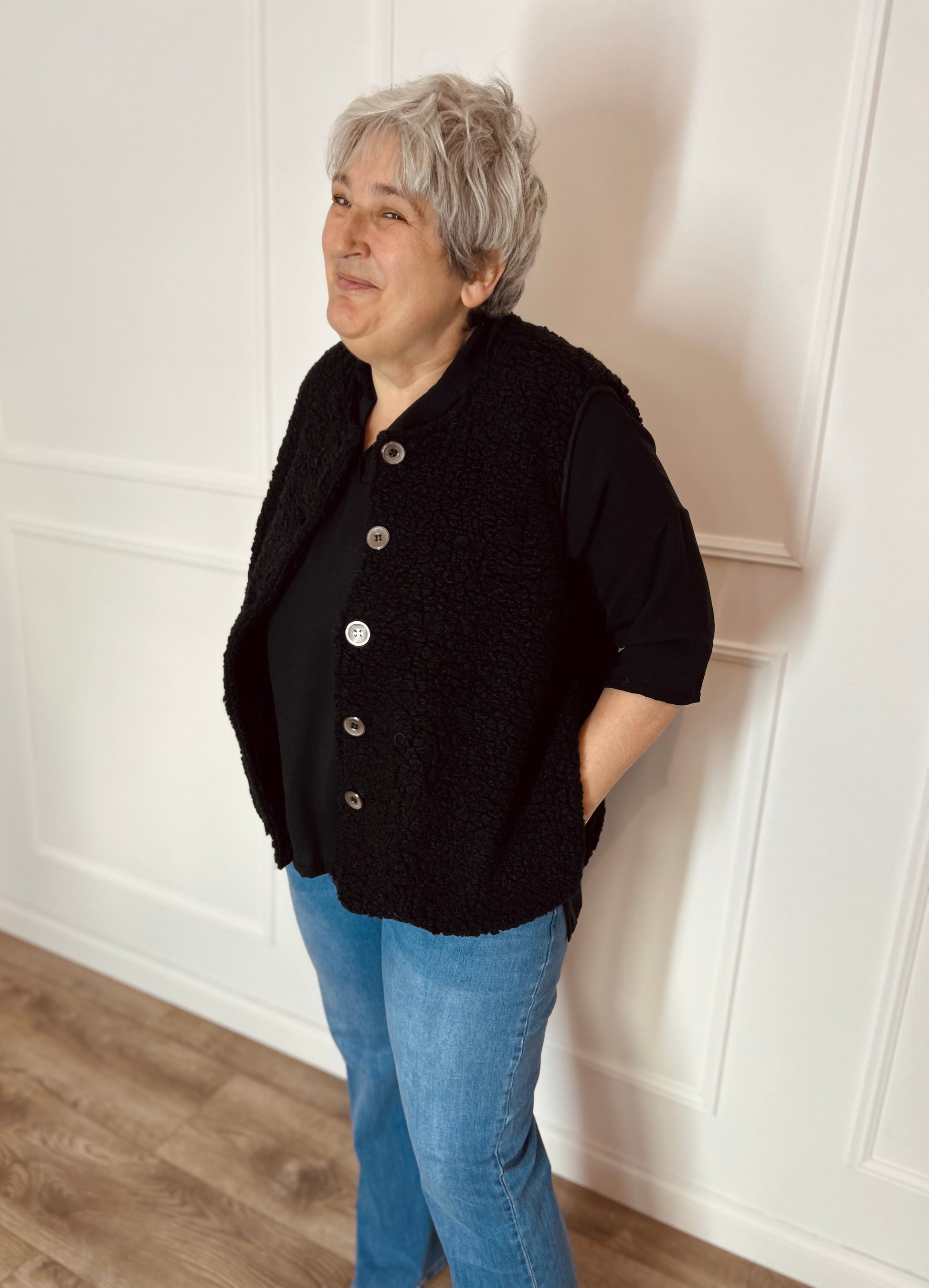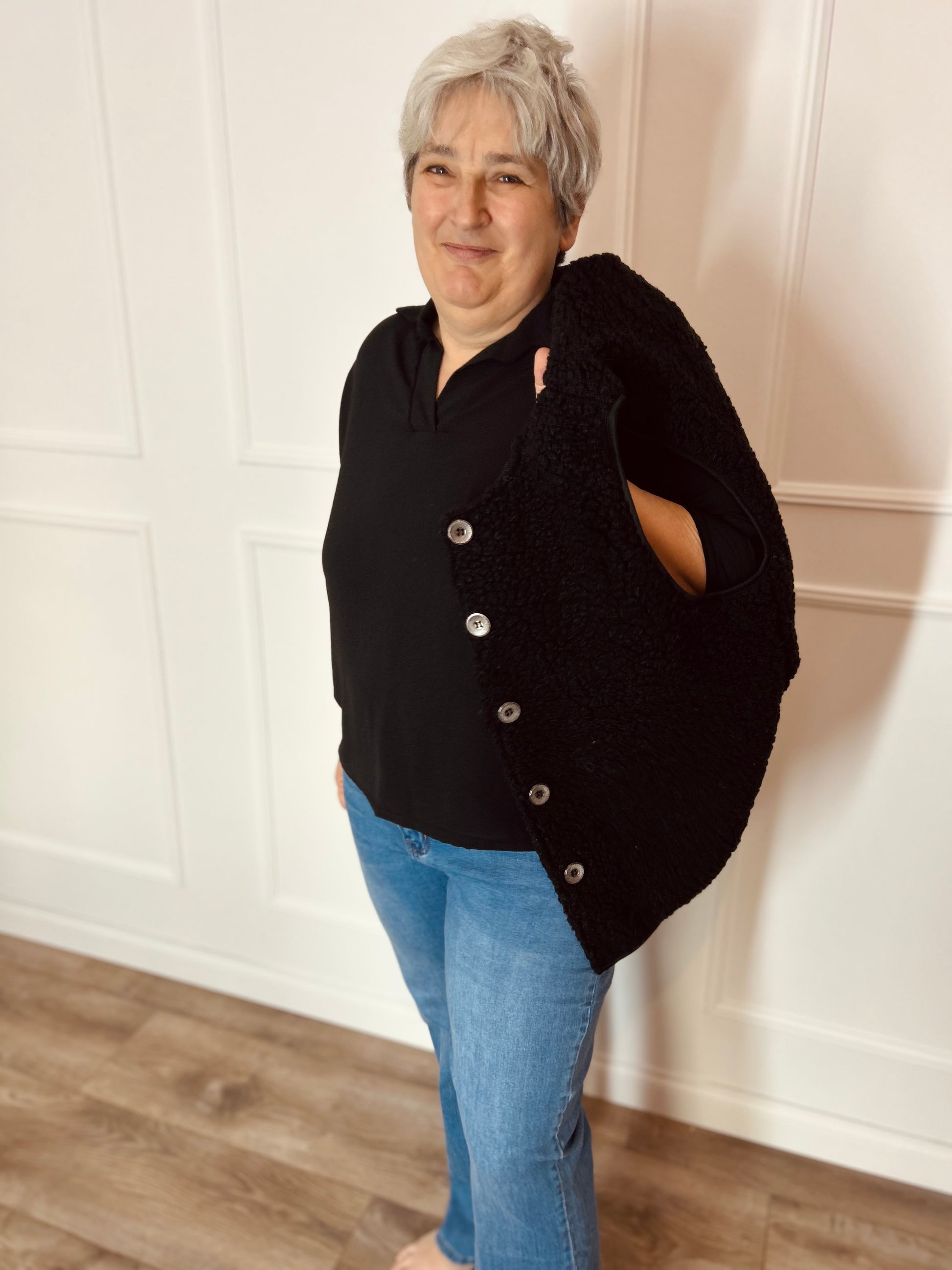 Teddy vest Pauline is een mouwloze vest met knoopjes om dicht te doen, maar de meeste dragen dit open. De vest heeft een teddy stofje en zakjes aan de zijkant. De vest is super zacht & comfy. De vest heeft een aangename lengte, niet te kort, niet te lang. Dit vestje kan je op heel veel dragen zoals bv een blouse, coltrui, t-shirt, jurk, hemd,...