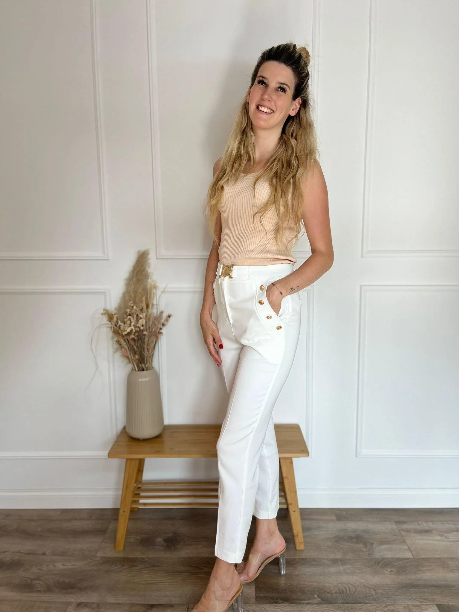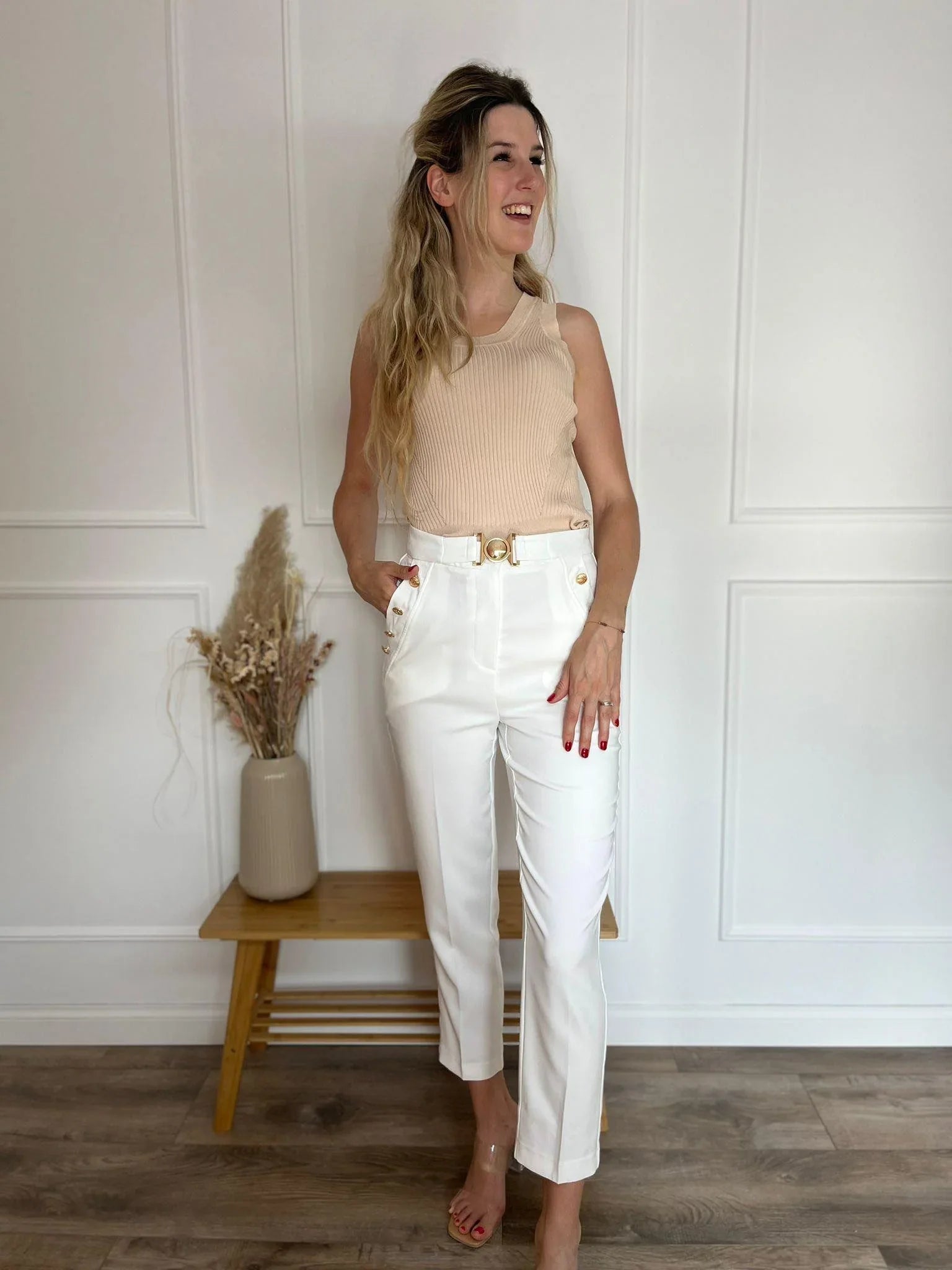 Beige top met ronde hals, strepen en een stretcht stofje.