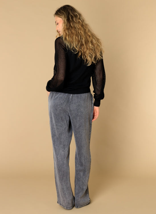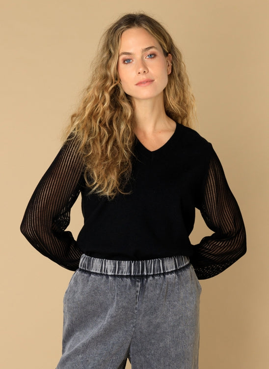 Elsie is een gebreide trui met een vrouwelijke V-hals en elegante mouwen van fijnmazig breisel. De mix van structuur en eenvoud maakt dit item veelzijdig én stijlvol.