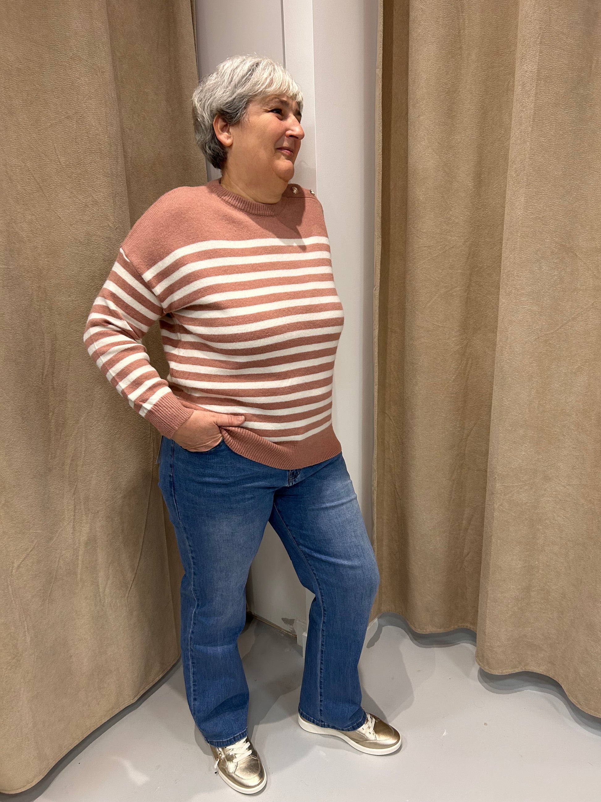 Deze gestreepte trui in het oudroze is een echte eyecatcher in jouw garderobe. Deze trui heeft aan 1 schouder leuke gouden knoopjes.