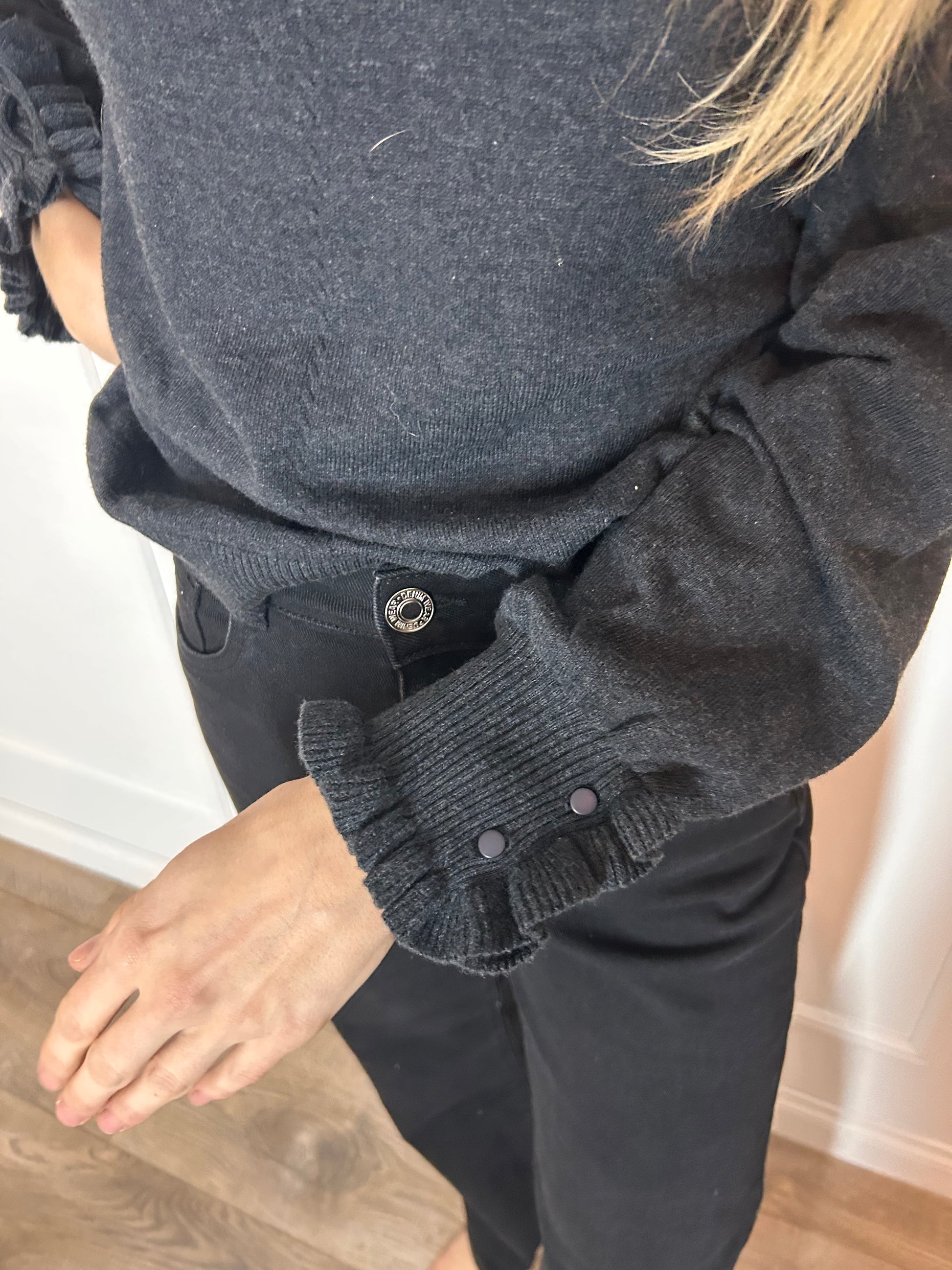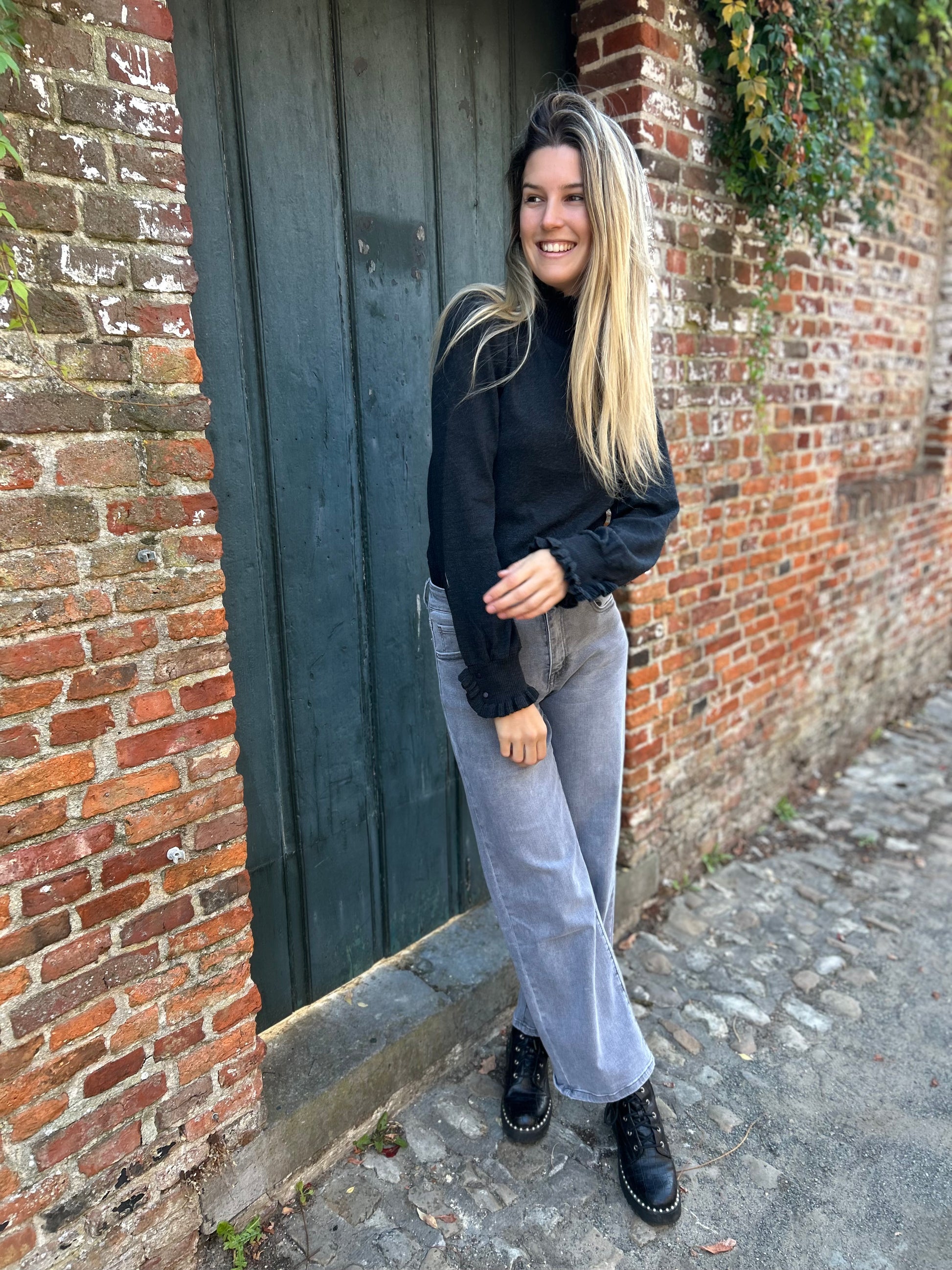 Trui Nadine heeft leuke ballonmouwen met aan de polsen een leuke krulletjes en knopen. De trui heeft een geplooide hoge halslijk en een prachtig kabelgebreide voorkant. We hebben deze trui in verschillende maten.