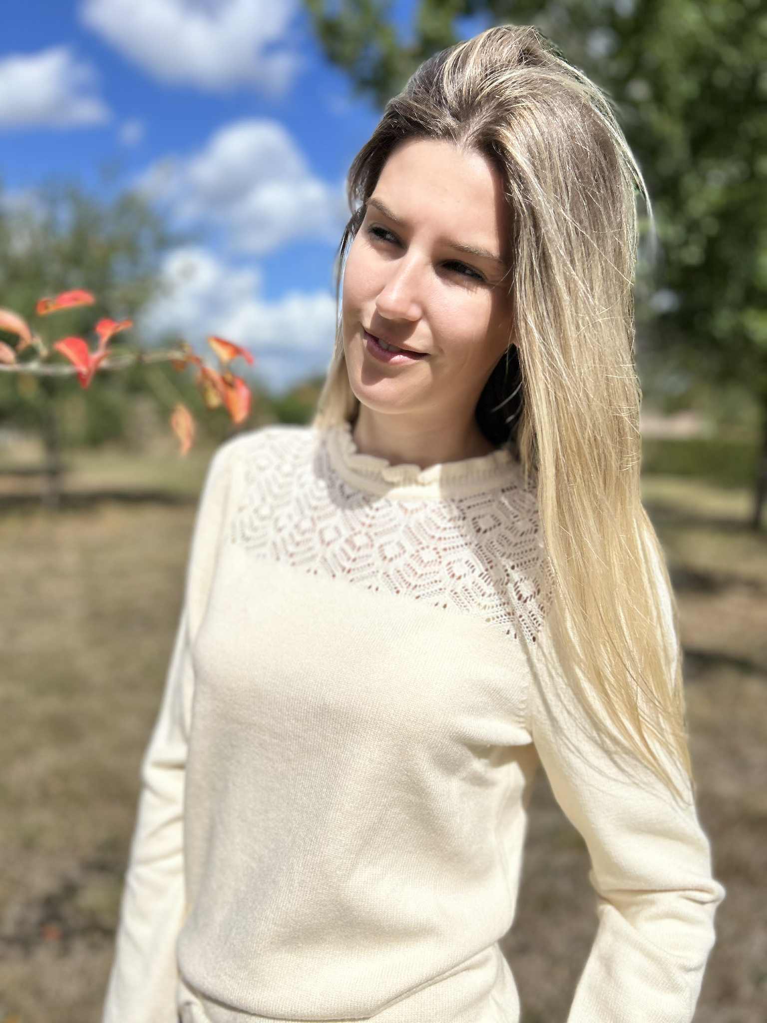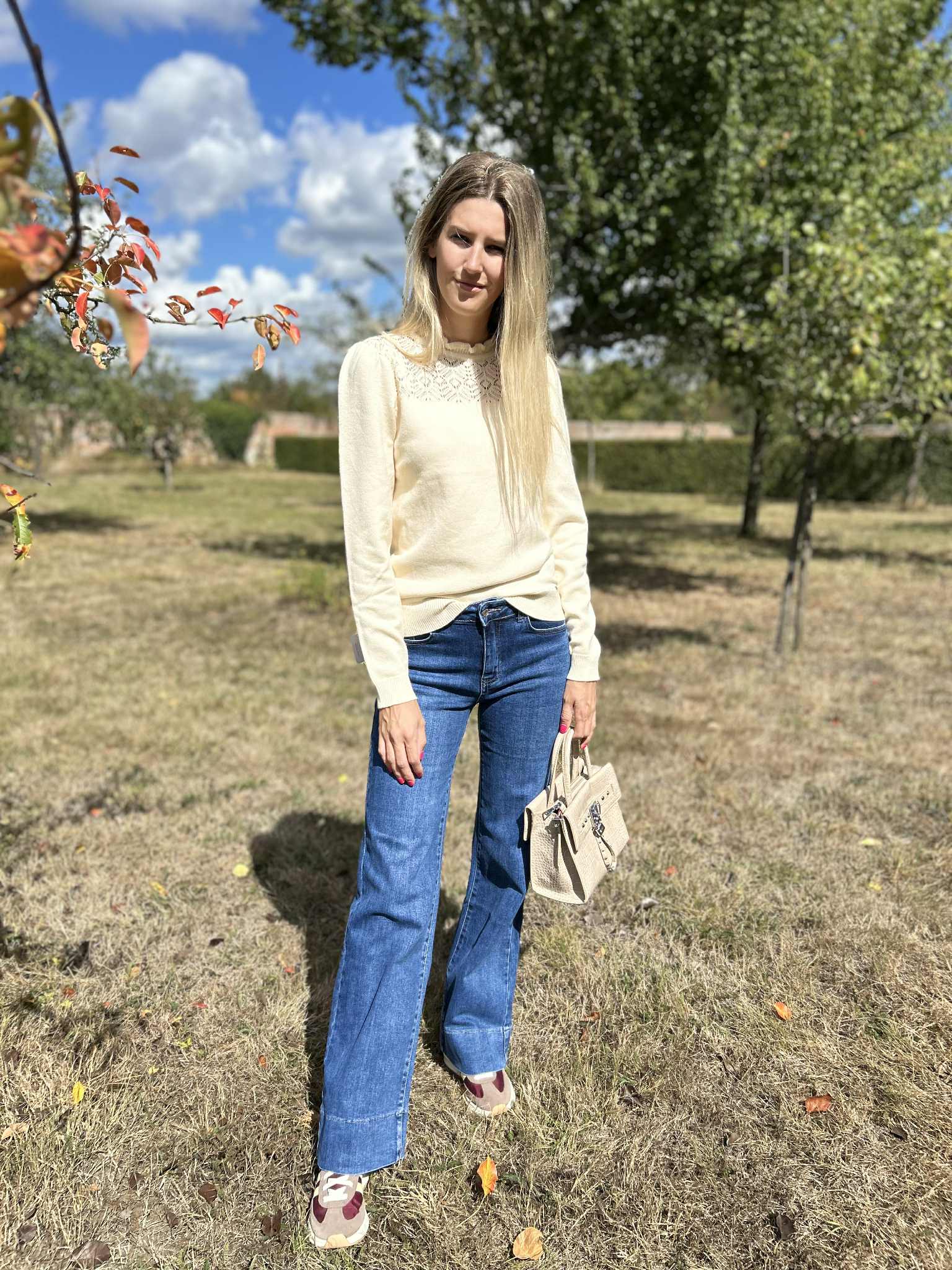 Zacht als een wolkje, met een romantisch randje. Deze trui is gemaakt van een soepele viscoseblend en heeft een vrouwelijke turtle hals met een verfijnd kanten inzetstuk. Verkrijgbaar in cream en mandarine—twee kleuren die je look direct zachter maken.