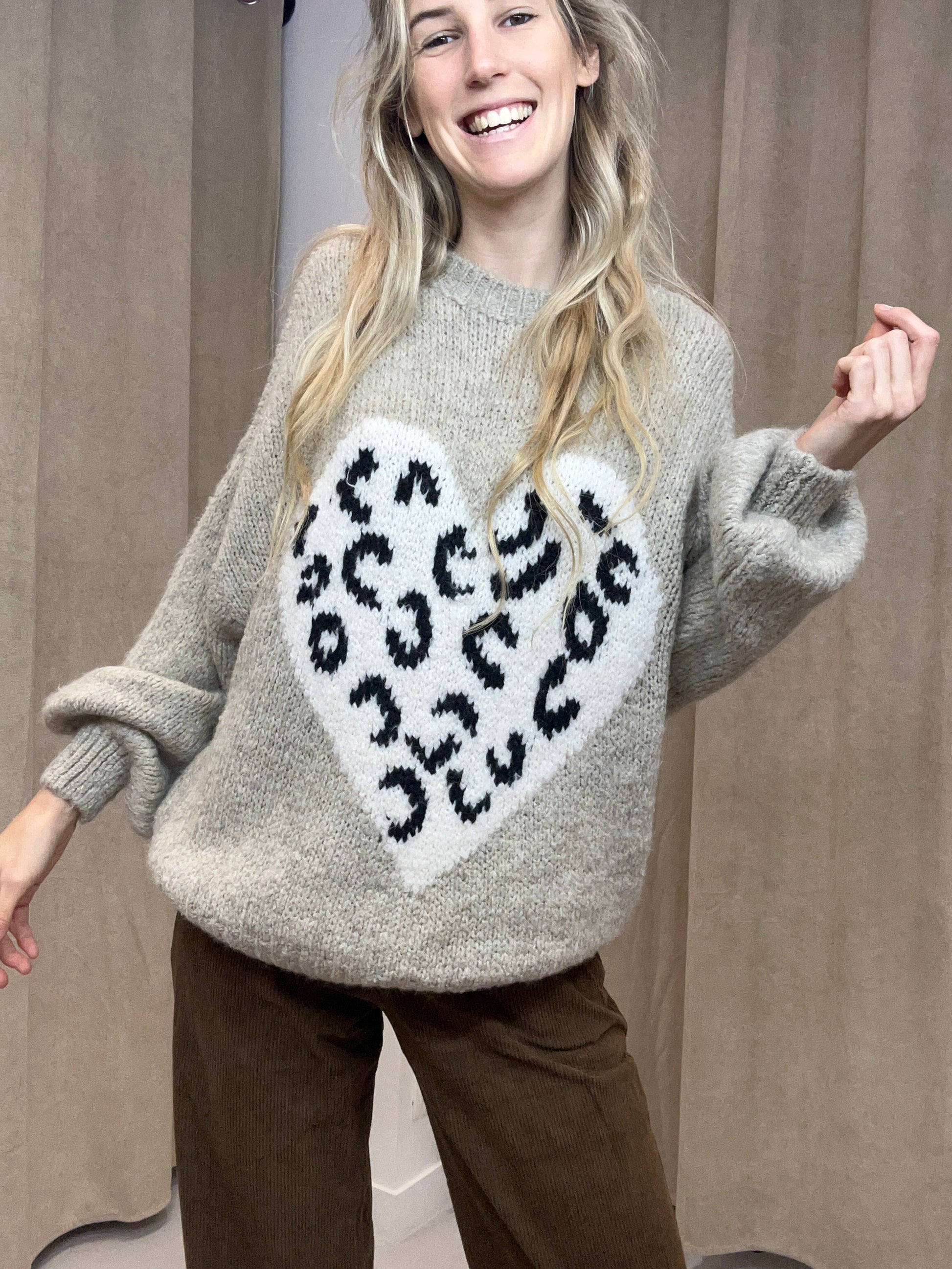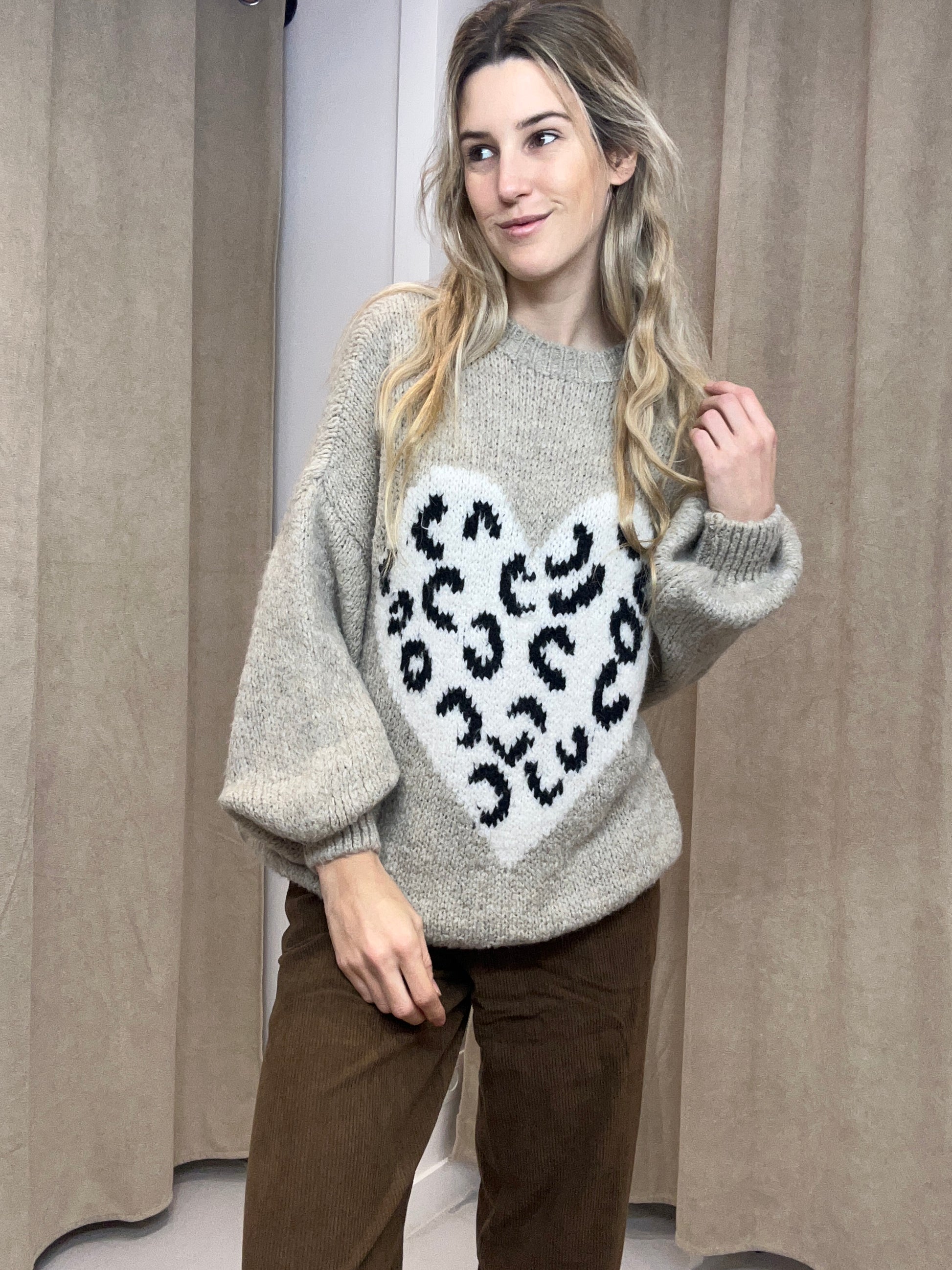 Het truitje heeft een lange mouw en heeft een mooi hartje in luipaard motief als detail op de stof. Het is gemaakt uit een wollen stof en heeft een ronde hals. Zalig om te dragen. Wij combineerden het truitje met ‘BROEK LIZZY BRUIN’.