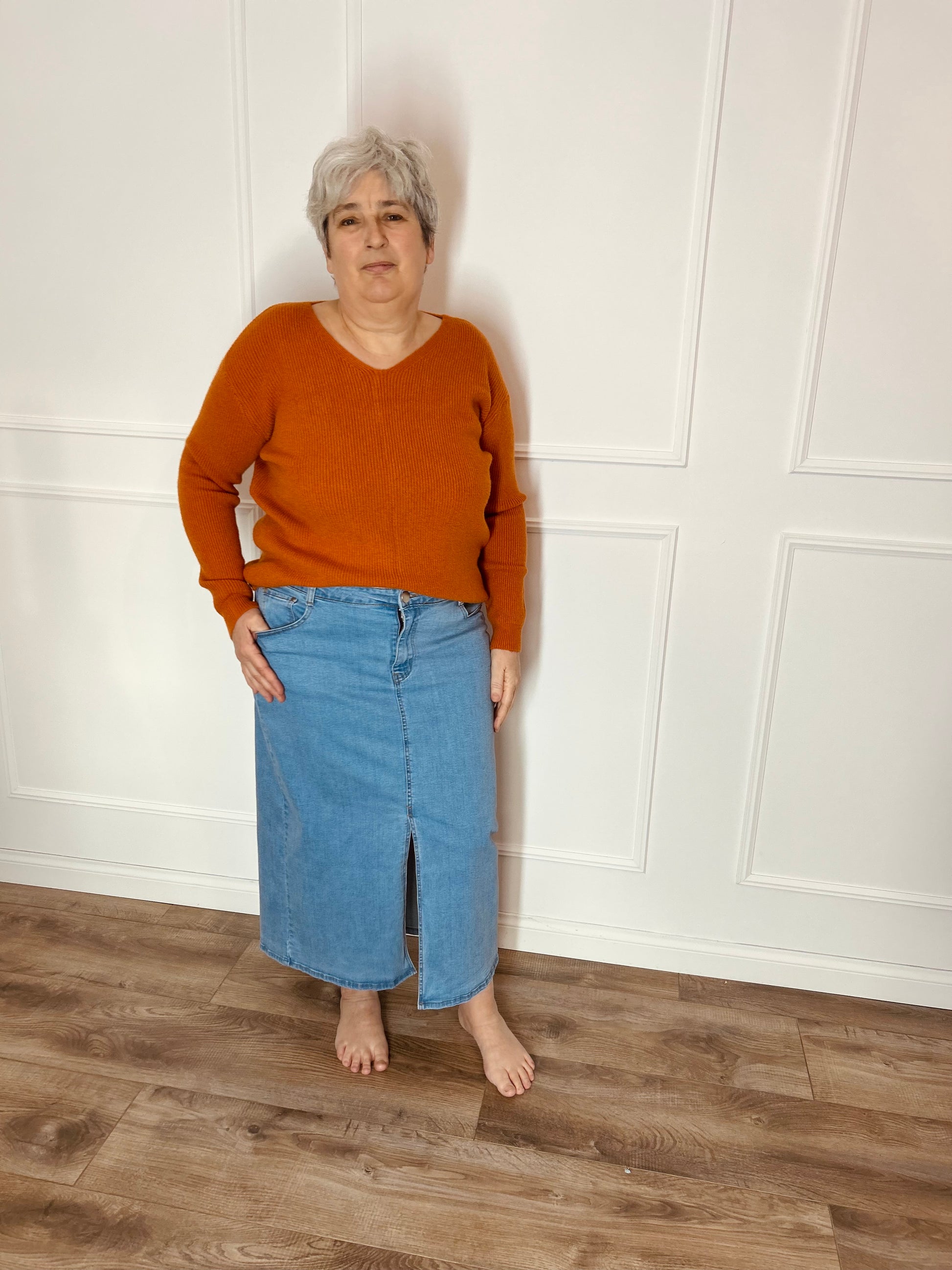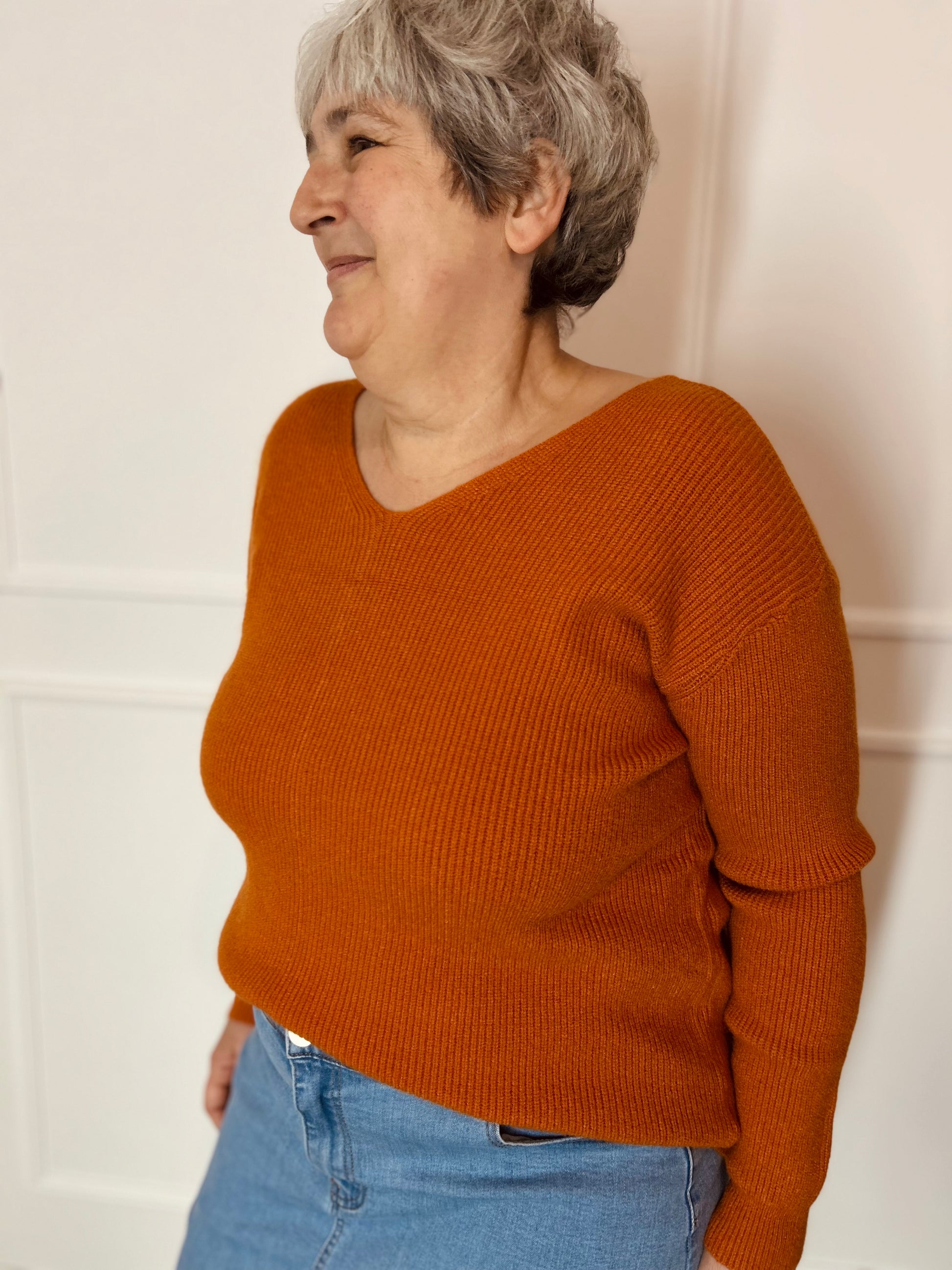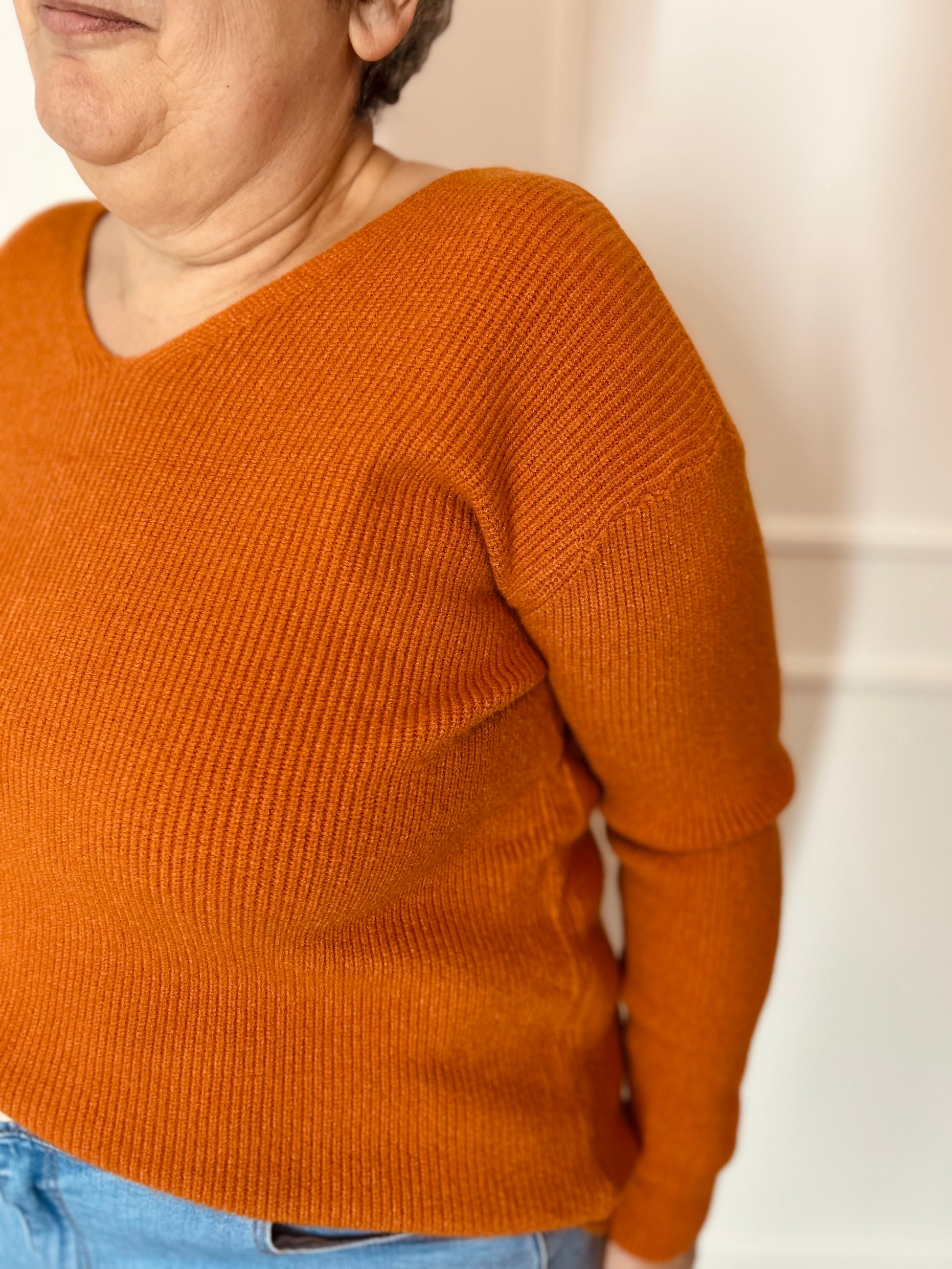 Leuke kleurrijke sweater met een V-hals en lange mouwen. Deze trui voelt super zacht aan. Deze trui prikt niet! Wij combineerden de trui met de 'MAXI JEANSROK BONNIE XL' samen vormen ze een mooi geheel.