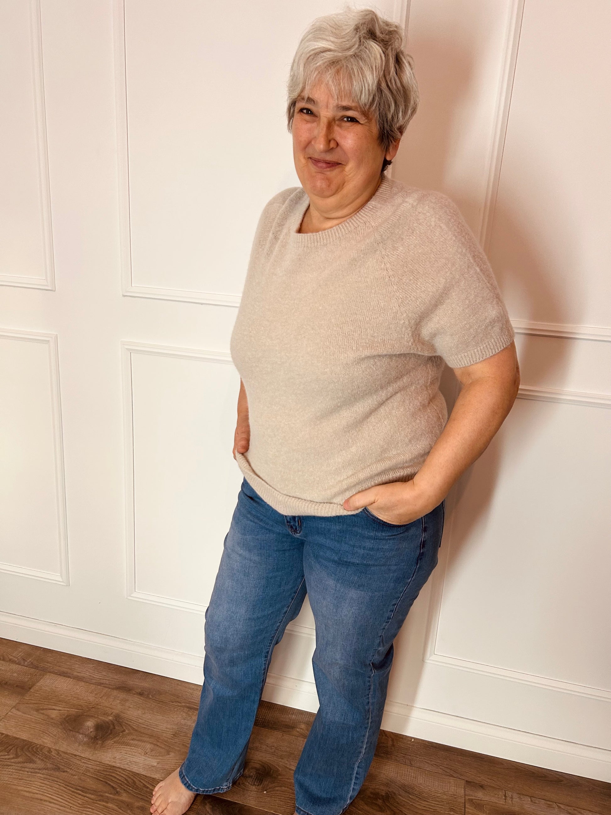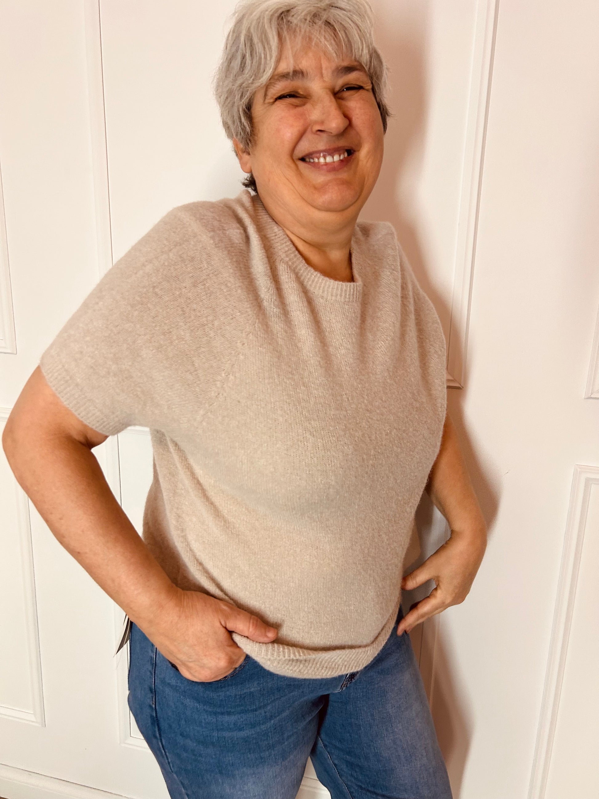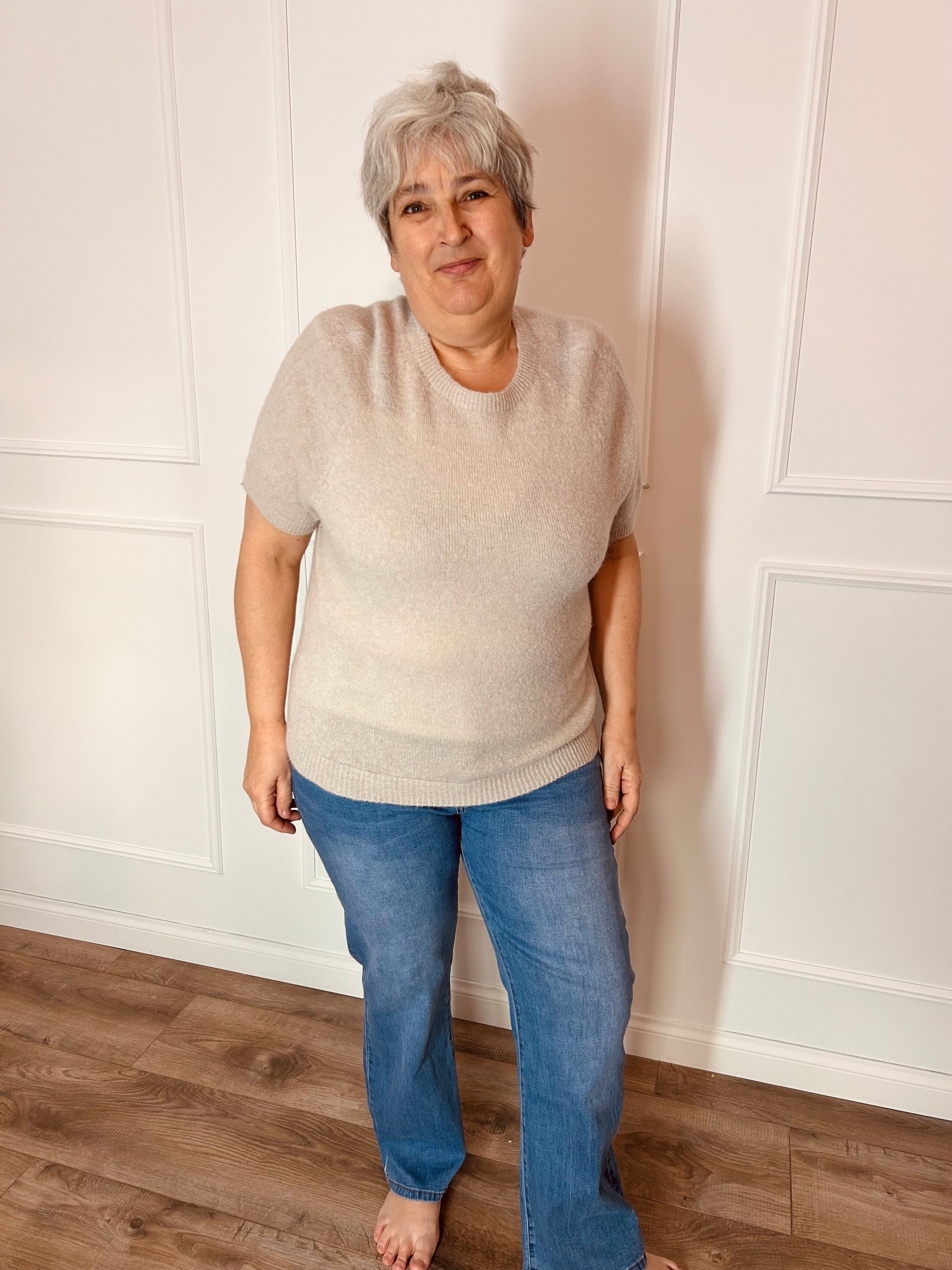 Truitje met korte mouwen van alpacawol en wol. Het truitje heeft een ronde hals en een mooi neutraal kleurtje. Dit truitje valt eindeloos te combineren. Dit truitje hebben we in één maat en kan gedragen worden van maat 42 tem 48.