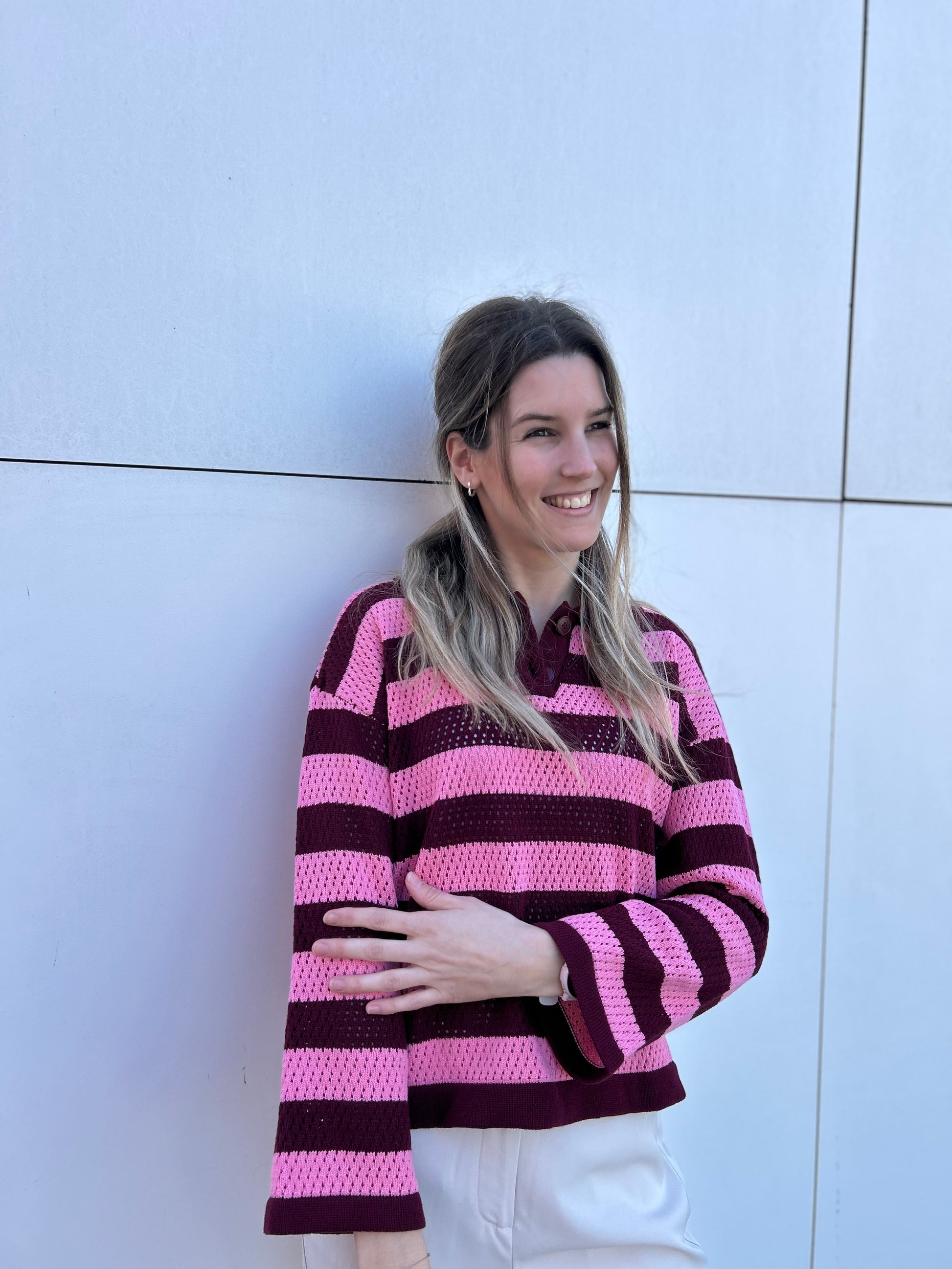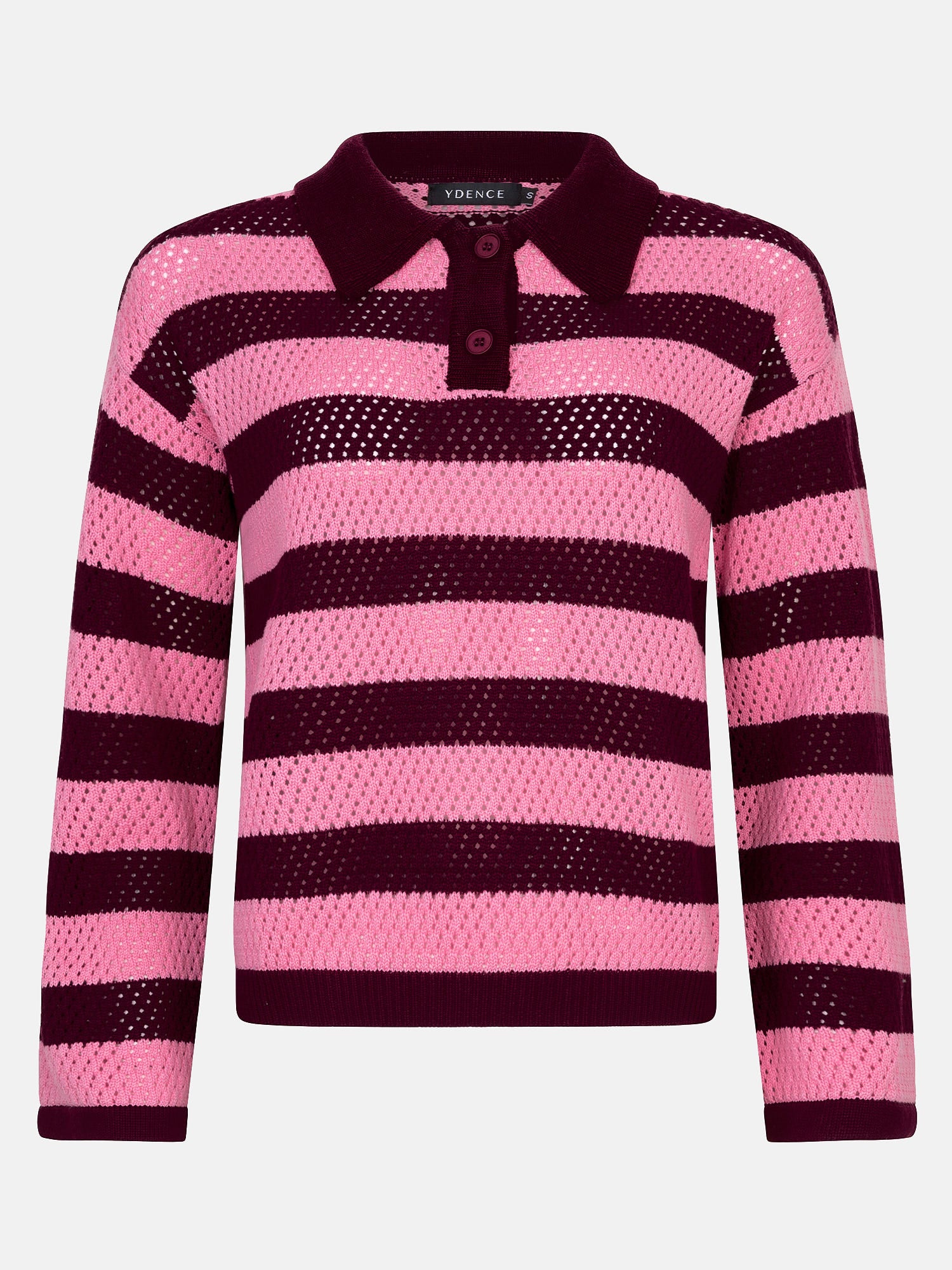 Knitted top Agnes is een knitted sweater met strepen en een echte eyecatcher dankzij de frisse kleurencombinatie en het speelse design. De polo-kraag met knoopsluiting geeft de trui een vrouwelijke maar ook stoere touch, terwijl het opengebreide patroon zorgt voor een luchtige, comfortabele feel.
