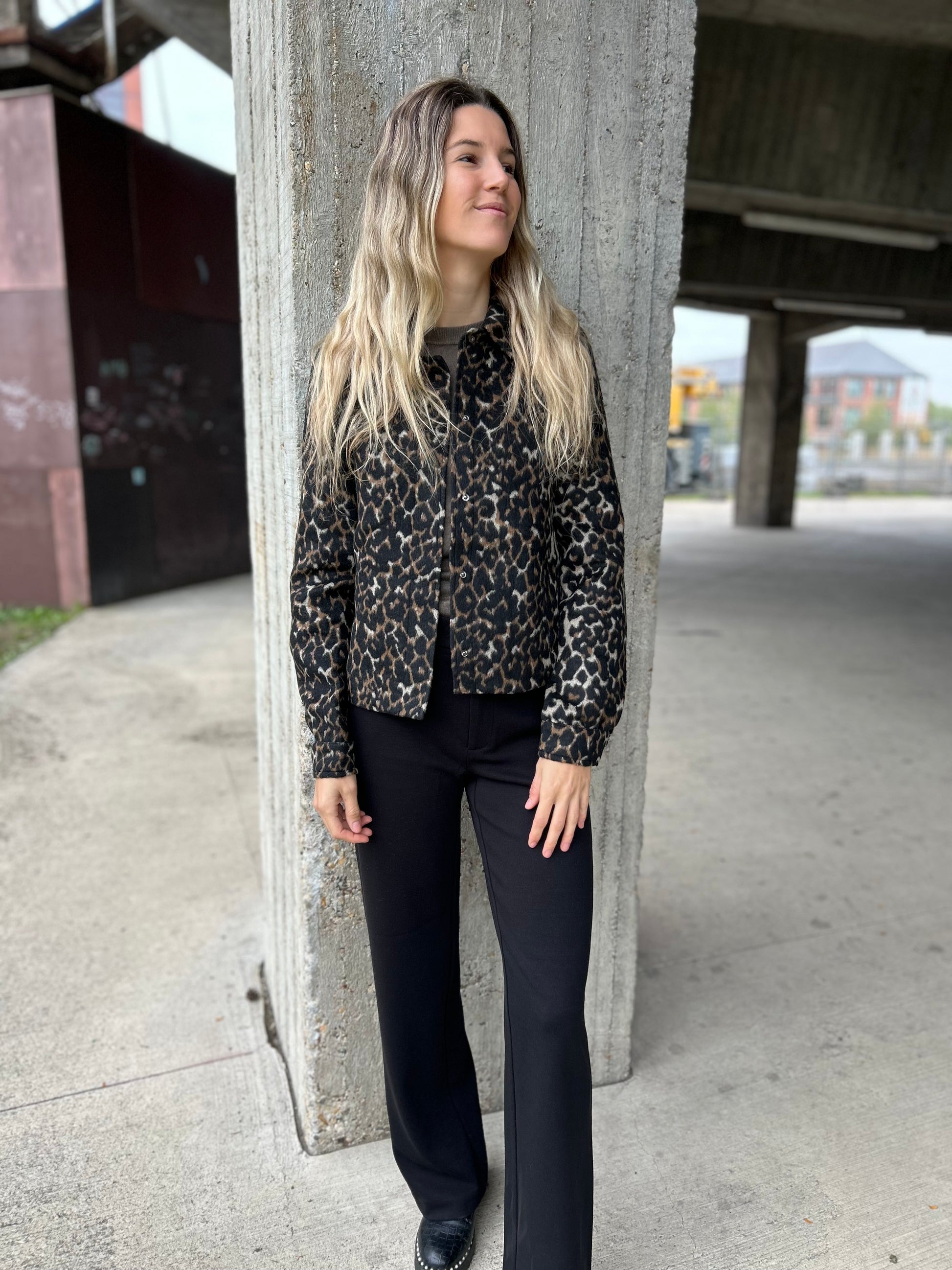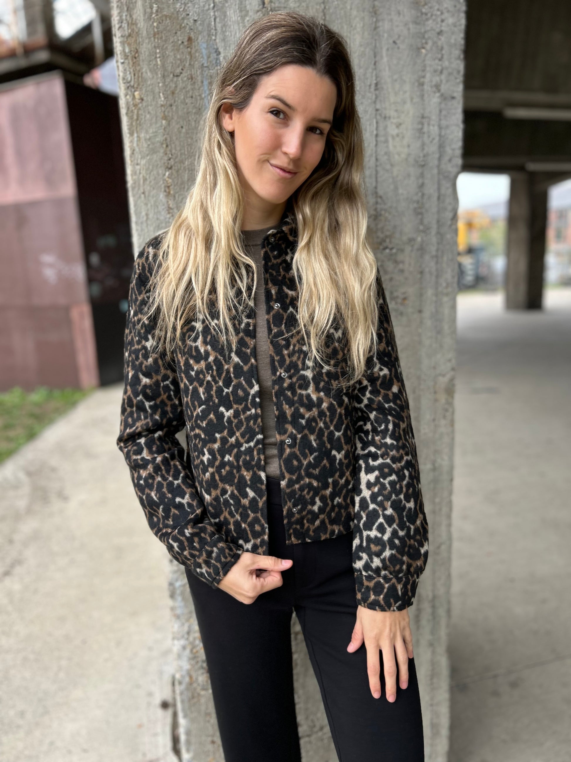 Dit jasje in zachte animal print kwaliteit is een veelzijdig item voor je garderobe. Het korte model sluit met drukknopen, heeft een kraag en handige zakken. Niet gevoerd, waardoor het luchtig blijft en perfect te dragen is als binnenjasje of als buitenlaag in het tussenseizoen.