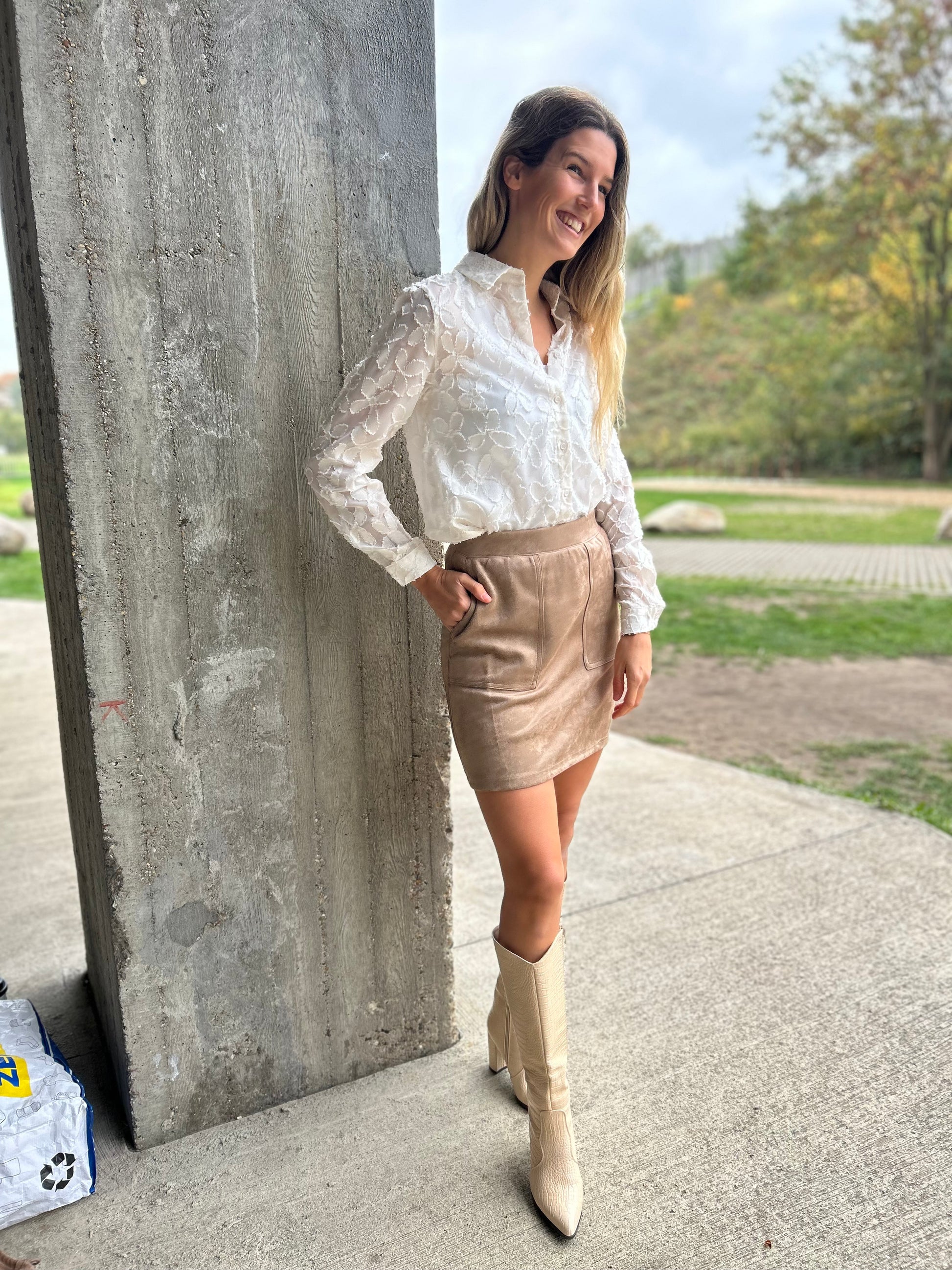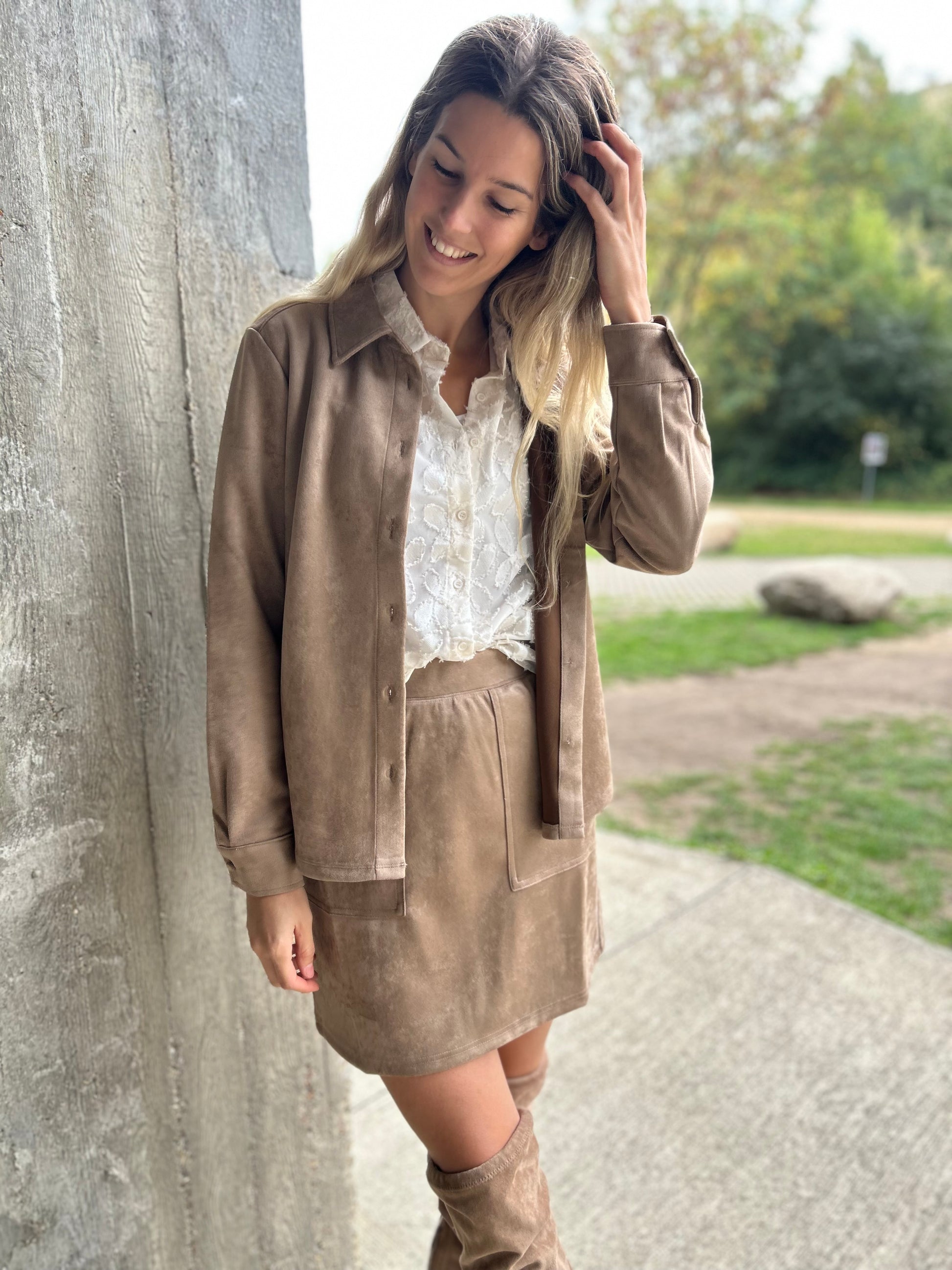 Deze minirok in suède-look is een echte allrounder: kort, zacht en stijlvol. Draag ‘m met het bijpassende jasje voor een strakke look, of mix ‘m met een grove trui voor een fijne, casual twist.