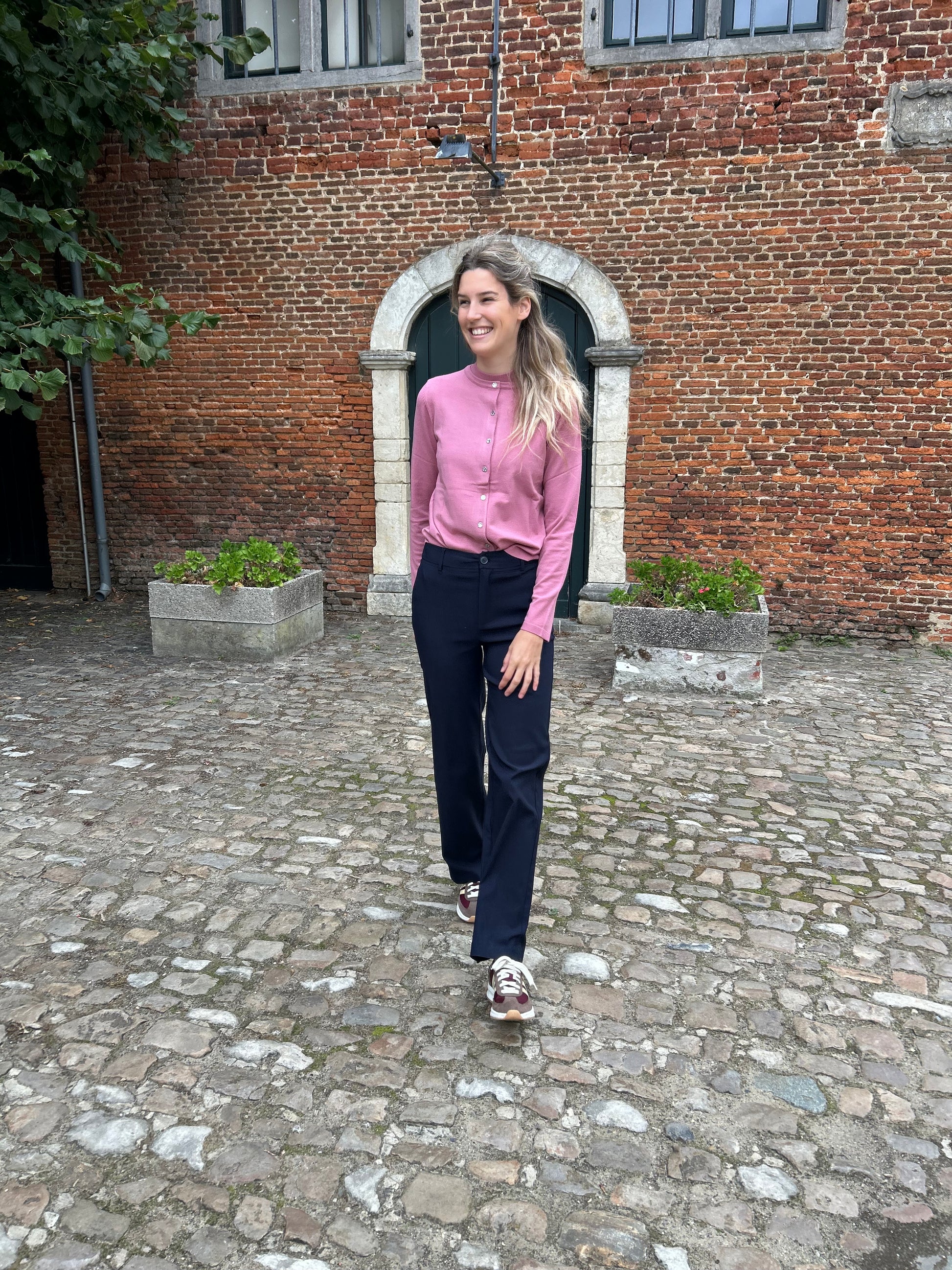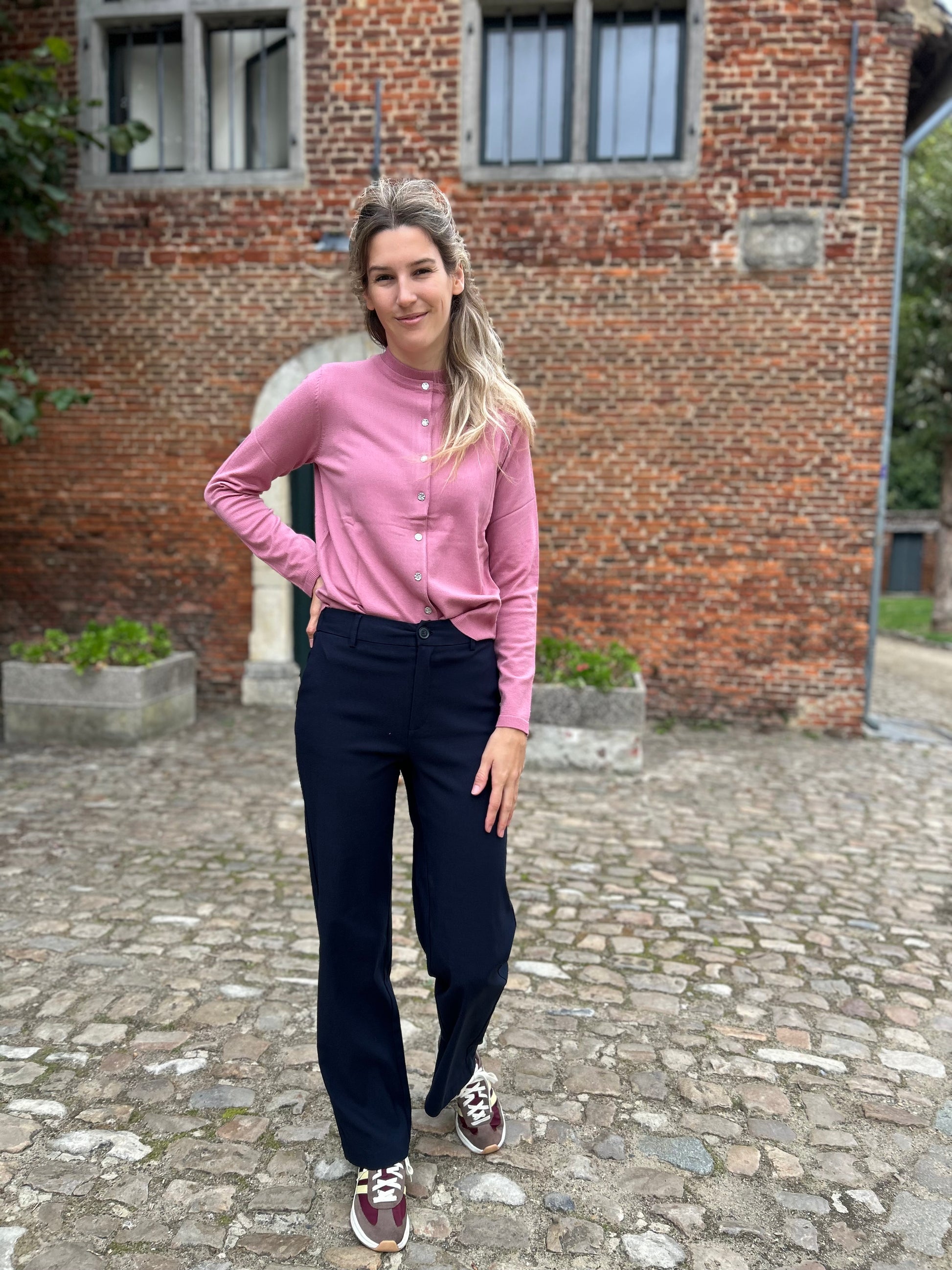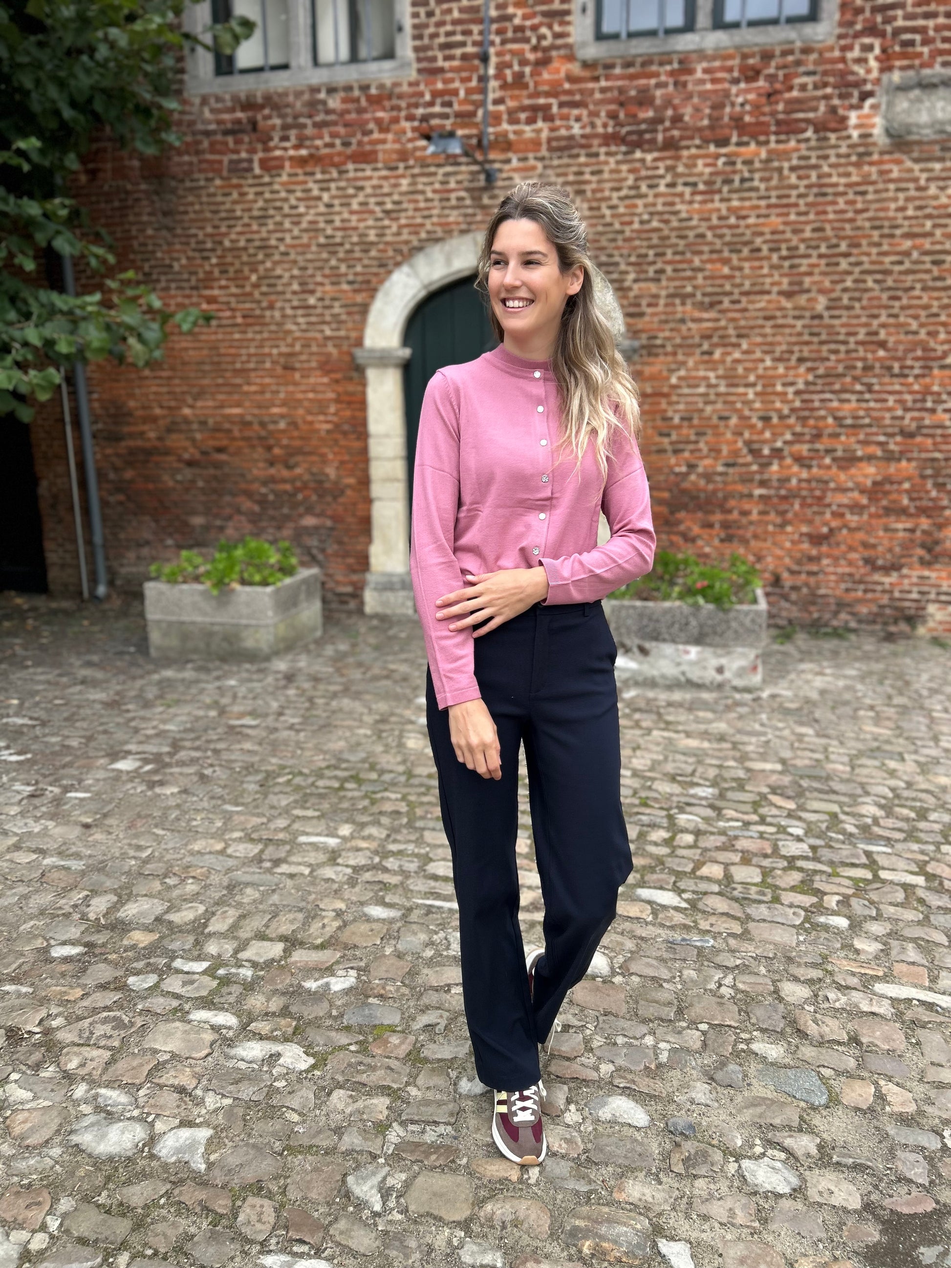 Dit klassieke gebreide vestje heeft een ronde hals en sluit met fijne knopen. Het zachte materiaal zorgt voor een comfortabele pasvorm.